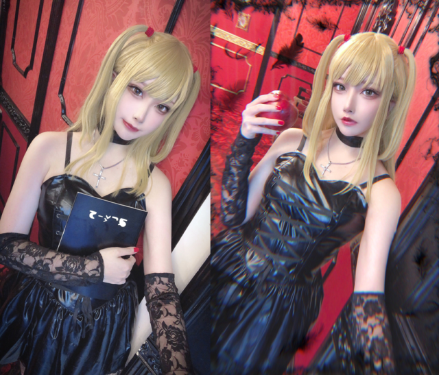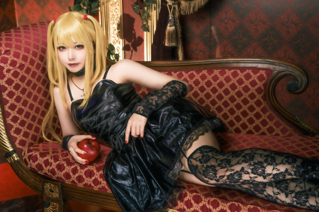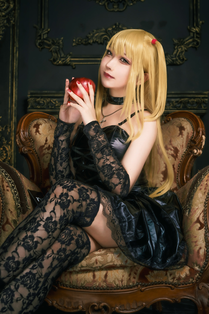 待つな 搭配上故事中設定彌海砂的「哥德蘿莉塔」服裝,搭配艷麗的妝容與神情,手持死神路克喜愛的蘋果,還原出彌海砂原作中的樣貌。