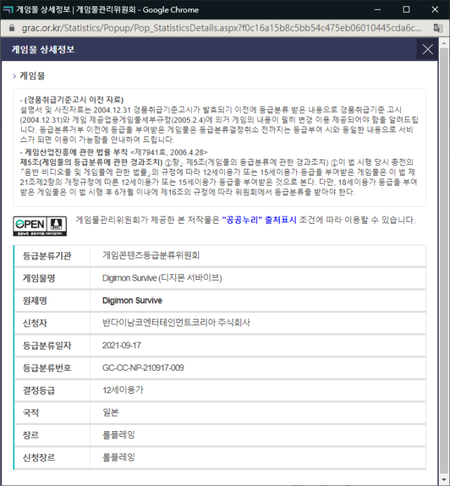 眼看2021年再剩兩個月多的時間就要過去,可能也不會再有任何下文的情況下,在今日稍早卻意外傳出這款幾乎成了都市傳說的《數碼寶貝 絕境求生》,已經通過了韓國電玩分級組織「遊戲物管理委員會(게임물관리위원회)」的分級,而這也是繼巴西與澳大利亞之後的分級消息。