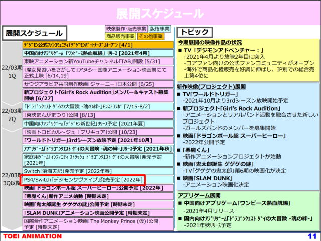 就過去東映的財務報告企劃,目前電玩發行商Bandai Namco是已經將原訂於2021年春季上市的《數碼寶貝 絕境求生》,推延至2022年內發售,而如今該款RPG遊戲的分級通過消息,或許也意味著這款再三耽誤的《數碼寶貝》電玩,終於有機會能夠跟等候已久的玩家正式見面了。