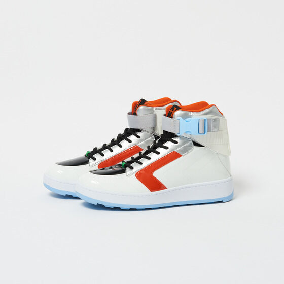 這次推出的造型球鞋,以《假面騎士Fourze》身上的配色與線條為靈感打造,銀色、紅色與淺藍色搭配,配合高筒鞋身的設計,整體有種未來感的模樣。並結合作品中「太空」的元素,在鞋後跟處有著 Fourze 服裝上小腿處的圖騰,搭配可調節的扣具綁帶,穿著起來格外舒適。