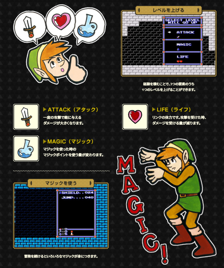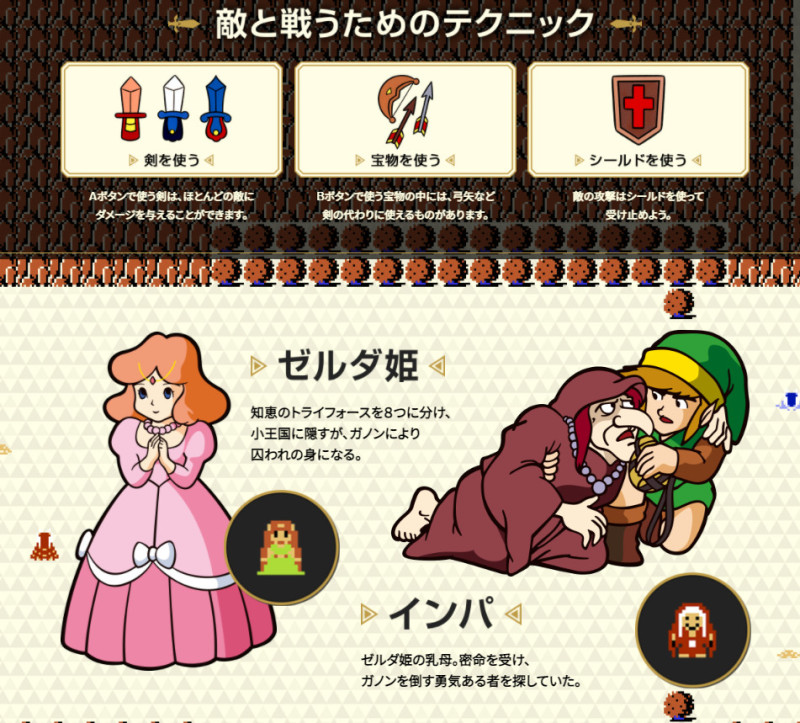 這次開設的官方網站,非常詳盡地介紹這三款薩爾達傳說遊戲的內容,包括遊戲的彩圖封面、玩法介紹、各個角色的介紹,以及遊戲中會出現的道具和其用途為何等等資訊,可以說是一個以現在角度包裝舊遊戲的全新復古遊戲網站。