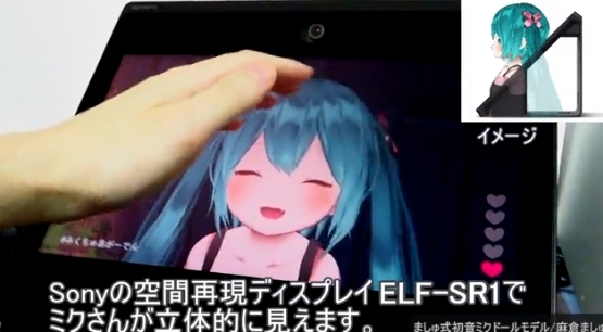 其中,Sony在企劃展區的空間「Sony Booth」,使用了能呈現立體投影般視覺效果的「空間再現螢幕」ELF-SR1,以裸視3D的方式呈現初音的模組。