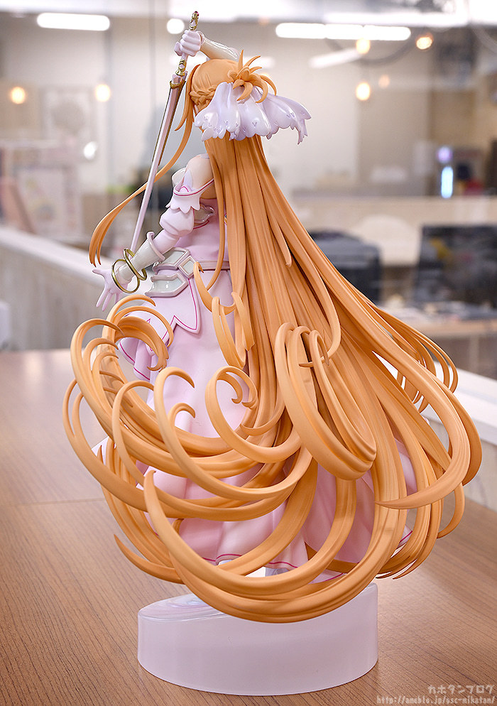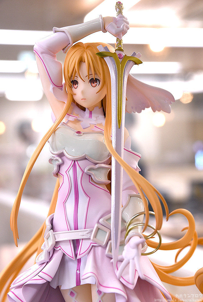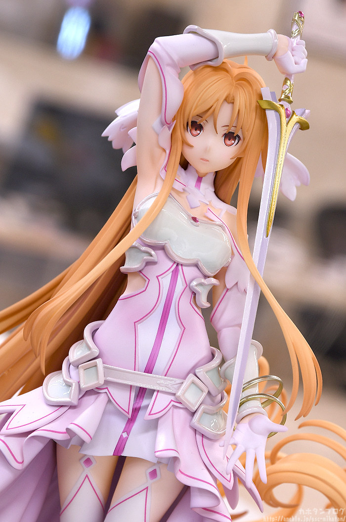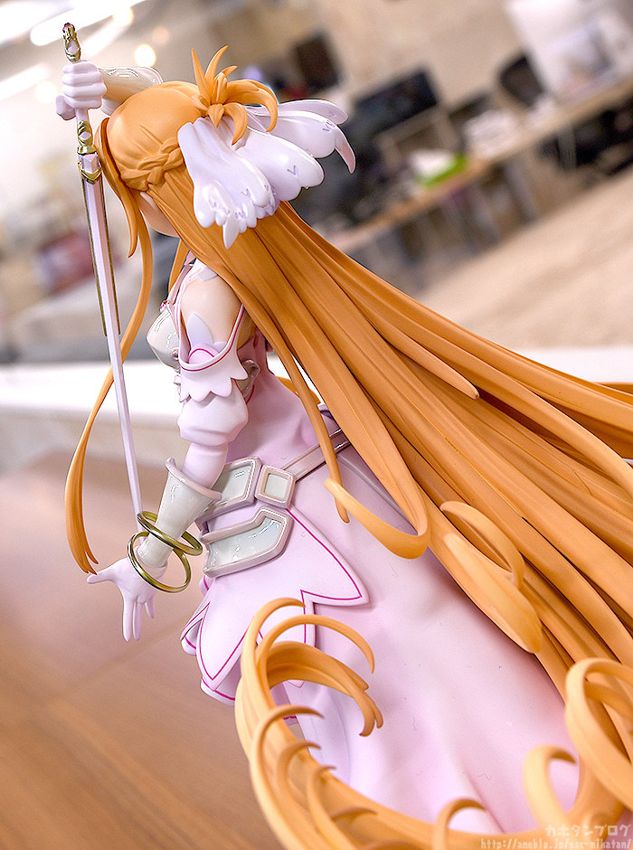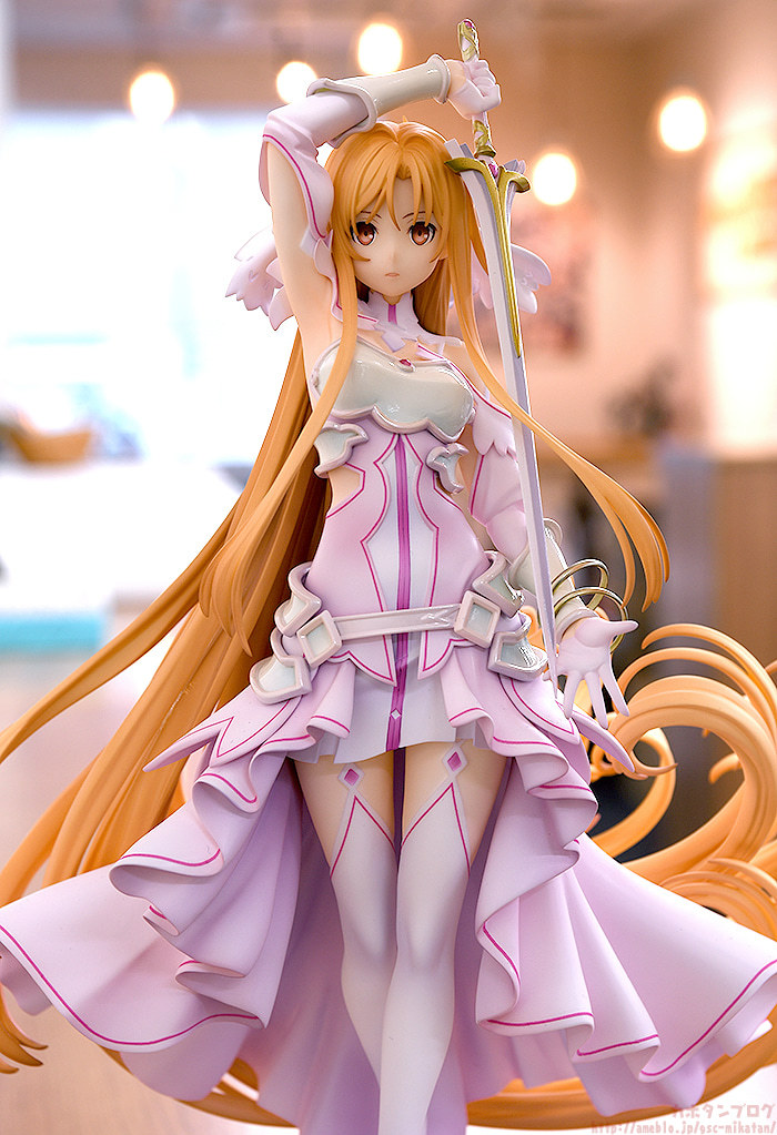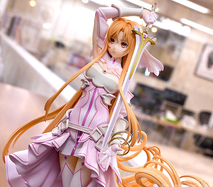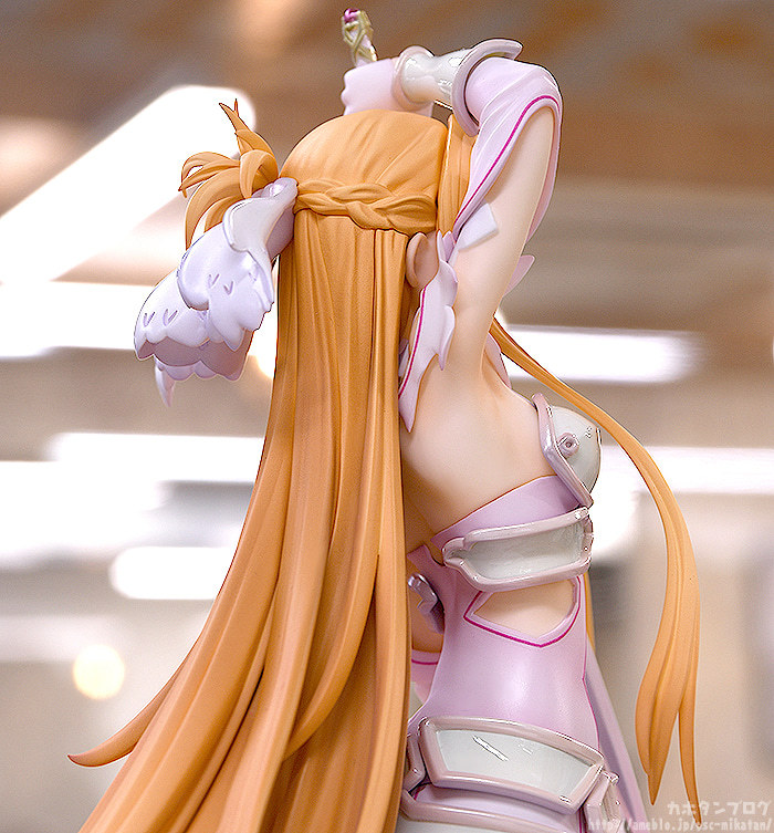 GSC「《創世神史提西亞》亞絲娜」1/7比例模型,以官方插畫為基礎,將亞絲娜作為創世女神史提西亞的形象立體化,尺寸全高約 295 mm,特色的橘髮髮絲仔細刻劃,大膽的長髮、捲起的髮尾優美在風中舞動;華麗垂墜的裙擺的飄動也完整製作,營造出輕盈且飛舞般的動態效果。盔甲部分採用柔和的珠光塗裝,手中的神器「Radiant Light」散發金屬光澤,還原整體堅強而美麗的造型!