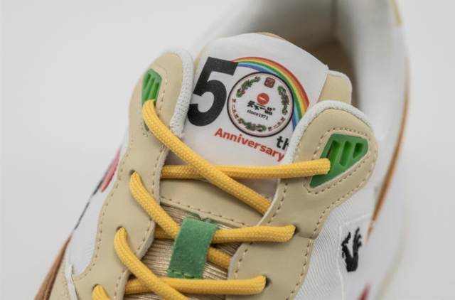 各位可以看到在鞋子的鞋舌與側邊上不僅有著「天下一品」的商標,甚至連拉麵的湯頭、麵條、蔥…等主餐配料,成為了鞋子配色的一部分,特別是鞋帶的部分特別採用的拉麵麵條的黃色,感覺就有種真的拿麵條來綁鞋帶一樣,是相當有趣且充滿巧思的潮鞋設計。