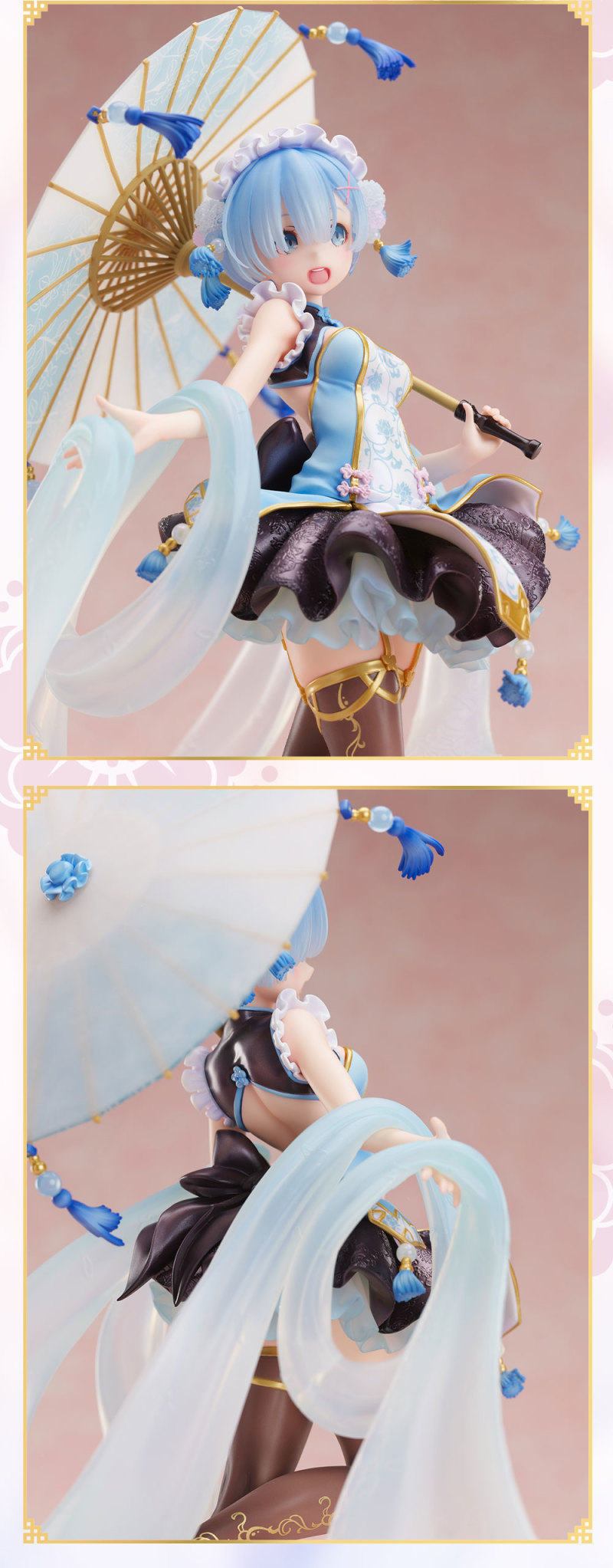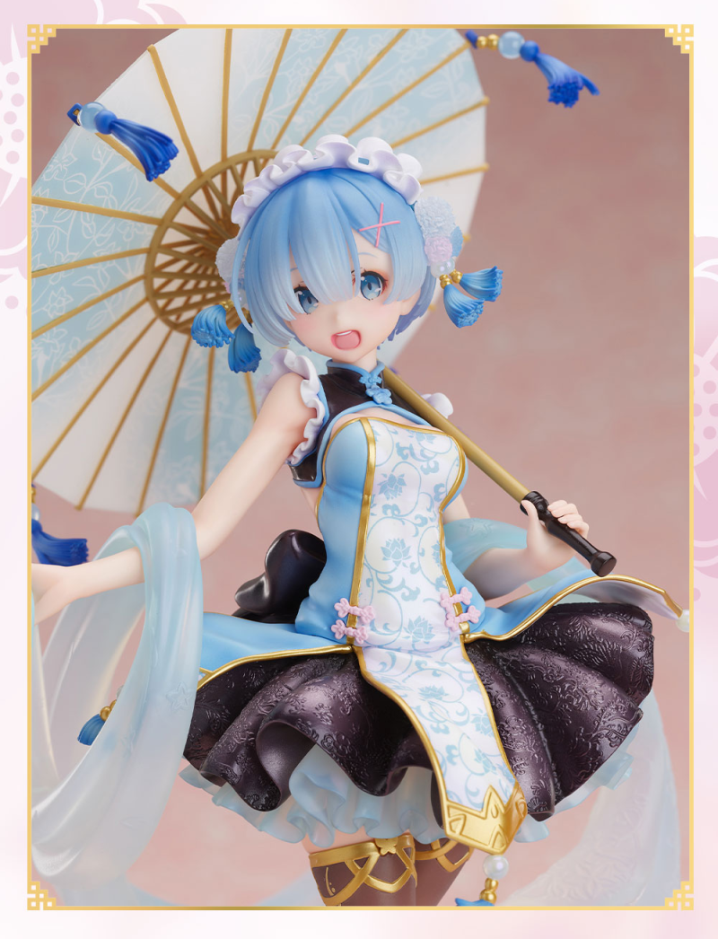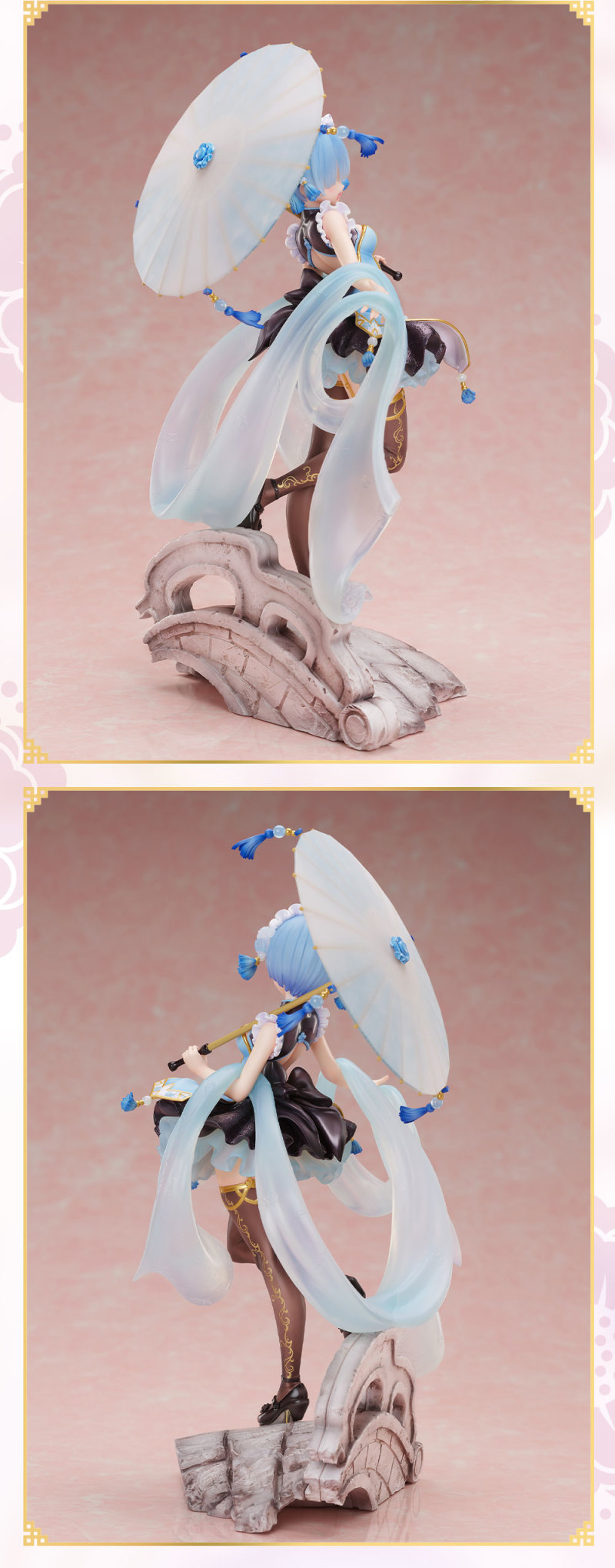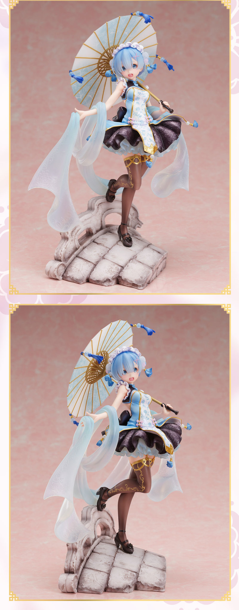 BeBOX「雷姆~Qilolita」1/7 比例塗裝完成品,尺寸全高 29.5 公分,將雷姆塑造成穿著中華+蘿莉塔風格的Qilolita(チィロリータ)服裝造型,在雷姆特色的淡藍色色調中融入旗袍、鑲金邊與中國結等元素,並保留有女僕裝的荷葉邊等設計;雷姆開朗的笑容、華麗的澎裙細節加上露出美背的剪裁,相當引人注目!在配件的紙傘與絲帶使用透明材質製作,呈現輕透質感。此外,以石橋為底座,讓整體感更加豐富~