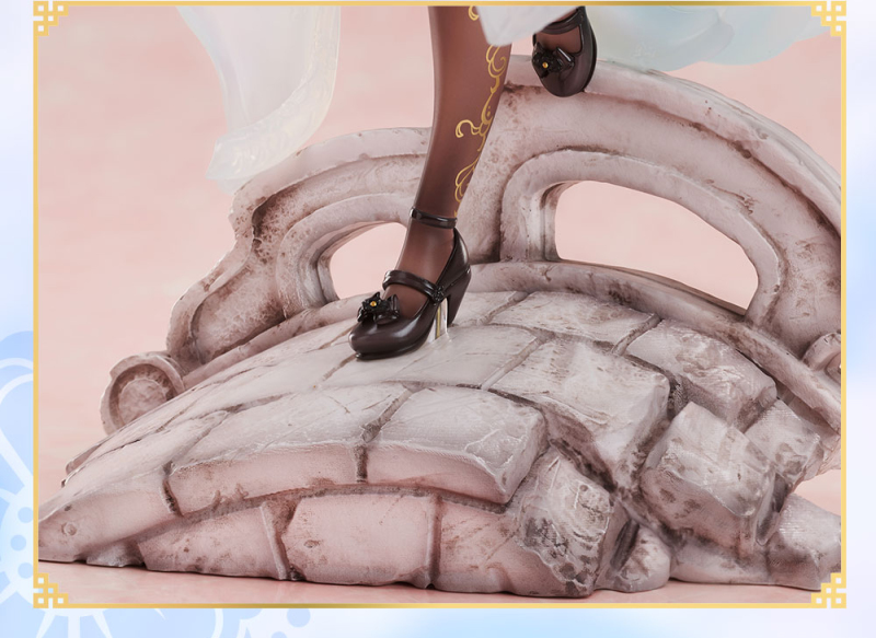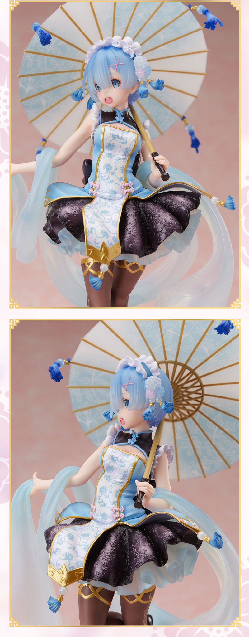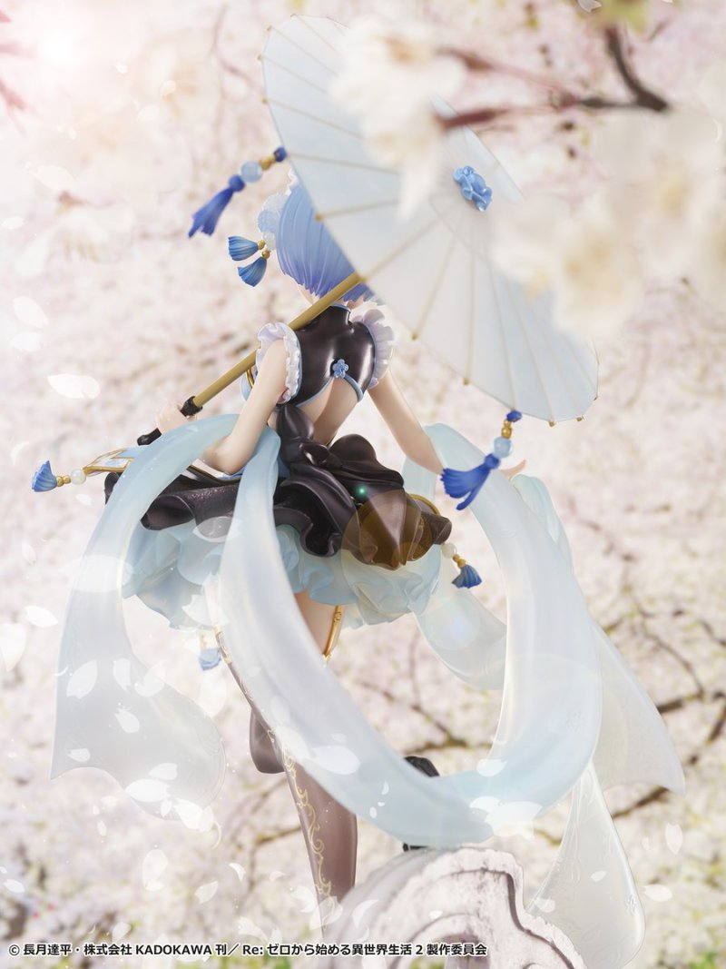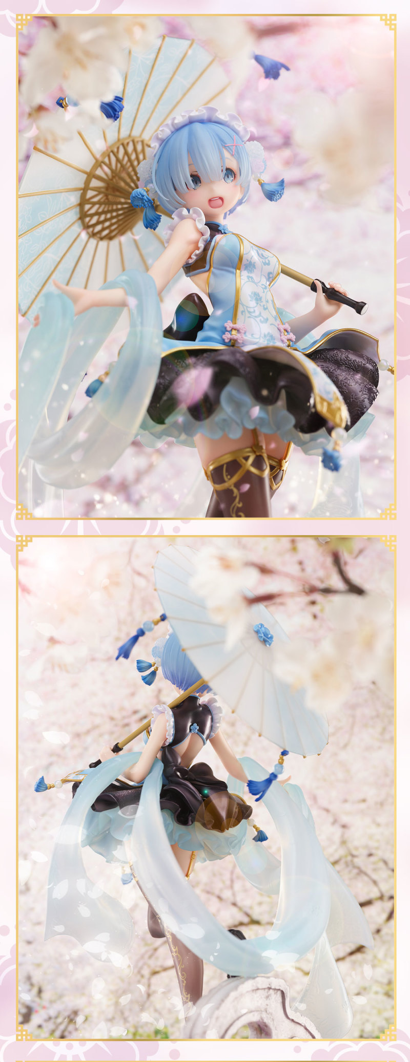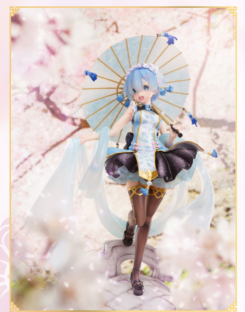 BeBOX「雷姆~Qilolita」1/7 比例塗裝完成品,尺寸全高 29.5 公分,將雷姆塑造成穿著中華+蘿莉塔風格的Qilolita(チィロリータ)服裝造型,在雷姆特色的淡藍色色調中融入旗袍、鑲金邊與中國結等元素,並保留有女僕裝的荷葉邊等設計;雷姆開朗的笑容、華麗的澎裙細節加上露出美背的剪裁,相當引人注目!在配件的紙傘與絲帶使用透明材質製作,呈現輕透質感。此外,以石橋為底座,讓整體感更加豐富~