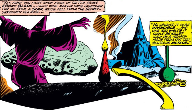 至於他手中的烏木劍的來源呢?戴恩的祖先是亞瑟王宮廷內的一位騎士「斯堪地亞的帕希瓦爾」(Percival of Scandia,不是著名的那位圓桌騎士),私下以「黑騎士」的身分保衛著卡美洛(Camelot)。為了培養這位騎士,梅林用一塊名為星石(Starstone)的隕石打造了這把被稱為烏木劍的強大武器贈予他。