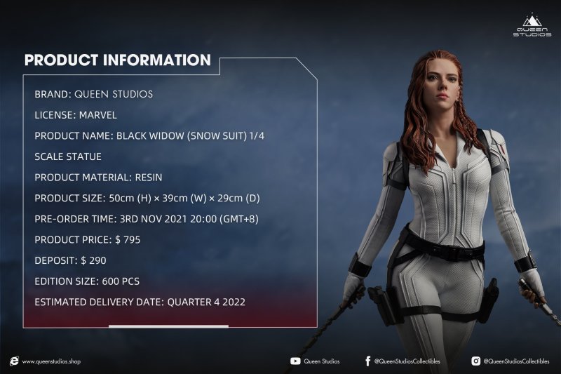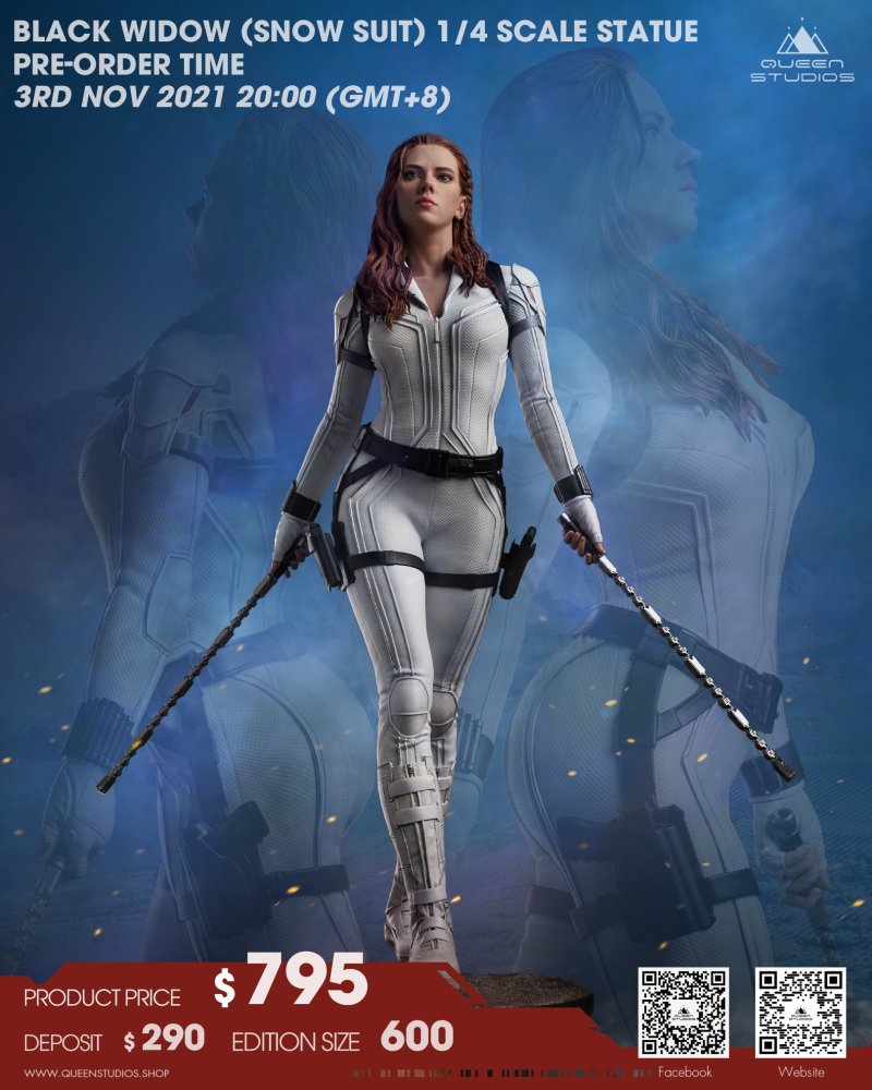 擅長以大比例雕像表現角色魅力、重現逼真細節的造型廠牌 Queen Studios 在以 MARVEL 電影《黑寡婦》為題推出同名雕像「黑寡婦」之後,日前再度發表身穿雪地戰衣(Snow Suit)版本的「黑寡婦」(Black Widow)1/4 比例全身雕像!預計 2022 年第四季發貨。