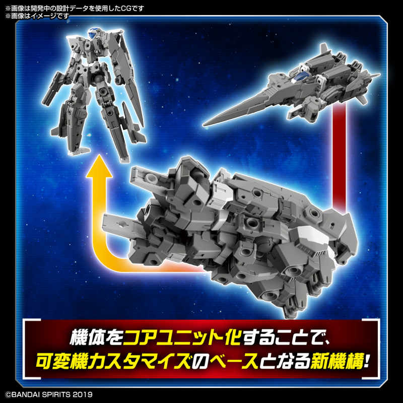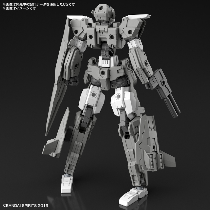 即將推出的『eEXM-30 埃斯波西托α』相較已發售的 β 規格,主體成型色以灰色呈現,並擁有更接近機首造型的盾牌零件、手持飛彈發射器、兩側小腿的推進器,全身設計了大量的 3mm 共通接點,能夠發揮創意運用 30MM、30MS 系列商品自由組裝、改造出可變型機體。