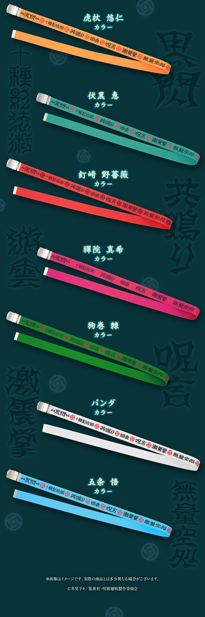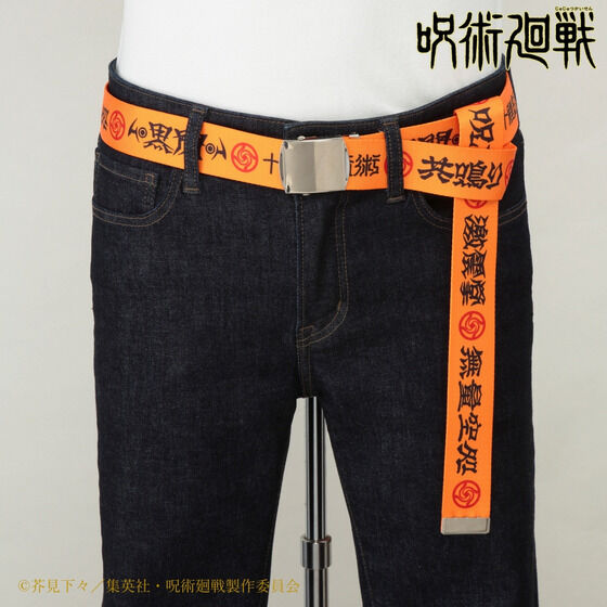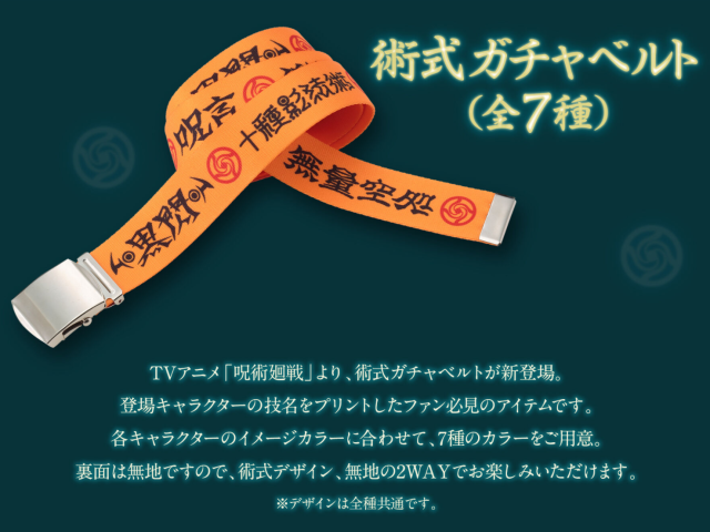 設計上將《咒術迴戰》角色所使用的術式或咒具以文字的方式印在帆布腰帶上,包含;虎杖的黑閃、伏黑惠的十種影法術、釘崎的共鳴、禪院真希使用的咒具-游雲、狗卷的咒言、熊貓的激擊掌與五條悟的領域展開-無量空處。