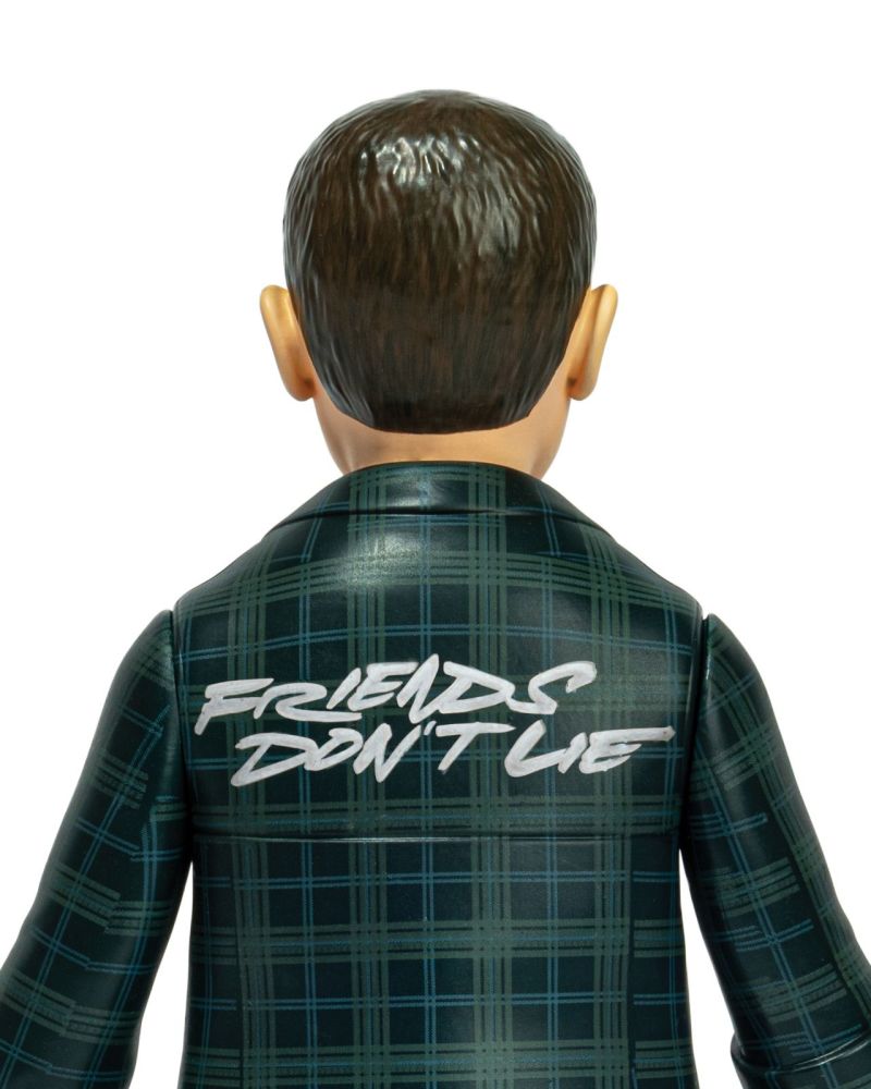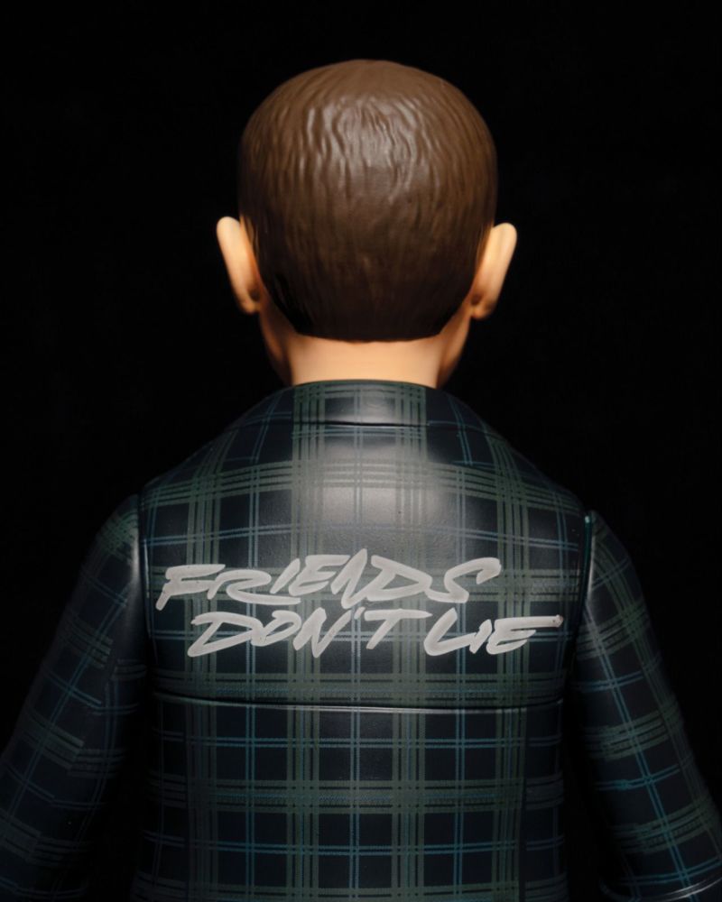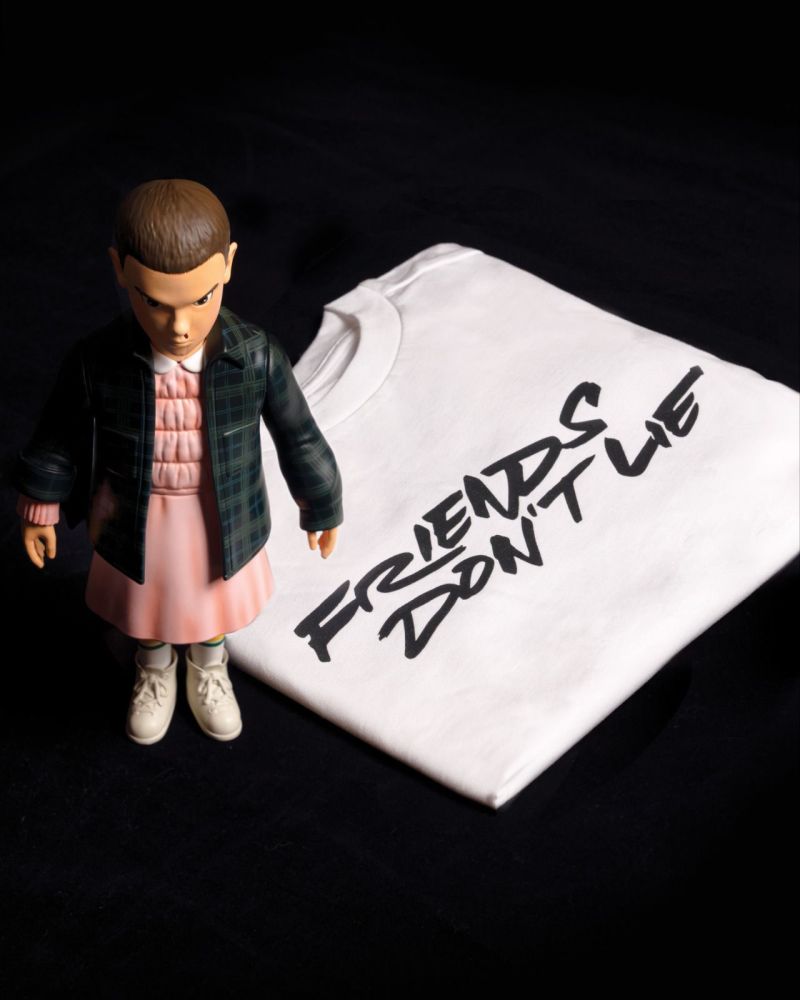 11月6日正是《怪奇物語》主角威爾失蹤、開啟一系列故事的起始之日,因此被訂為「怪奇物語日(Stranger Things Day)」,因此選定於此日發行別具紀念意義。 這款Eleven 軟膠玩偶將在背面印上知名藝術家FUTURA2000手寫的劇集經典對白「Friends Don’t Lie」字樣,並將推出兩種版本:套裝版Eleven公仔頭雕有鼻血塗裝,並付有一件「Friends Don’t Lie」字樣T-Shirt,限量116套;普通版不連T-Shirt及無鼻血塗裝,限量300套。