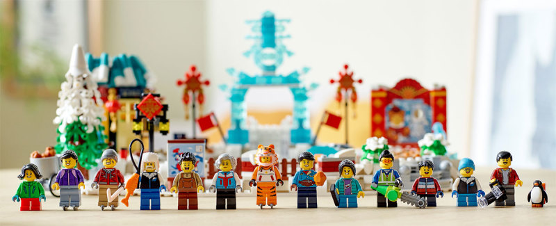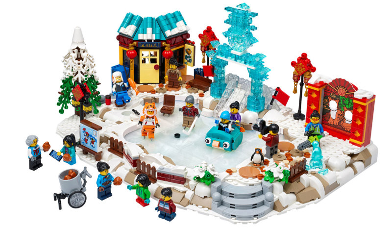 再來是圍繞著「冰雪節」為主題的新年盒組,讓人想到去年發售的「年獸的故事」,都製作出場景被白雪覆蓋的視覺效果,整體是一個熱鬧的滑冰場,並以豐富的樂高人偶、裝備出租店、拍照的虎年背景版、冰雕、烤地瓜小車......等點綴,還呼應了 2022 的「虎」年設計了一款具備年節氣息的老虎人偶,超可愛!另外,兒童可乘坐的企鵝造型雪橇也很有意思啊!