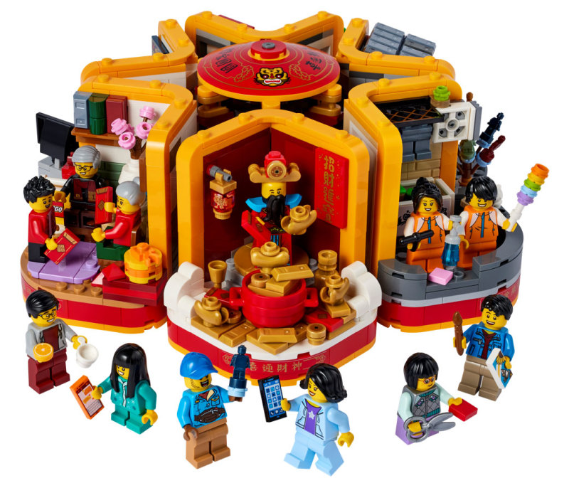 首先看到的是以 6 個迷你場景組成的「新春六習俗」,包含拜年、拿紅包、一家人團聚在客廳看電視,以及販售捏麵人的攤販......等,最有趣也極具意義的絕對就是財神爺的樂高人偶啦!從樂高開始製作大中華地區新年的樂高盒組後,我們擁有許多身穿大紅色長袍馬褂的人偶、紅包與年菜的印刷磚,不過這次帶來滿滿元寶的財神爺可說是再次讓人驚喜!能夠各自獨立、但也能搭配展示的模型設計也非常棒。