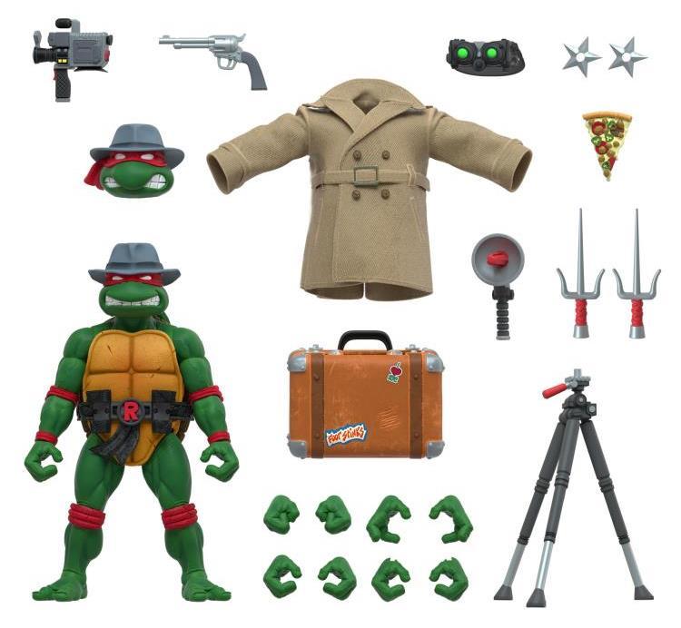 「偽裝拉斐爾」一直是忍者龜玩具中的一個人氣主題,這次 ULTIMATES! 的可動人偶高約 17.7 公分,打造出一個頭戴灰色紳士帽的拉斐爾本體,經典的漫畫風格與出色的肌肉線條十分帥氣,並附上材質柔軟的大衣、夜視鏡、攝影機、腳架、手槍、行李箱(附貼紙)、竊聽器......等搜集情報的設備,當然招牌武器-三叉、披薩也是不可或缺,而且還有一個不同表情的替換頭雕,加上豐富替換手型,整體相當吸引人,要買!
