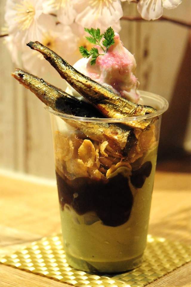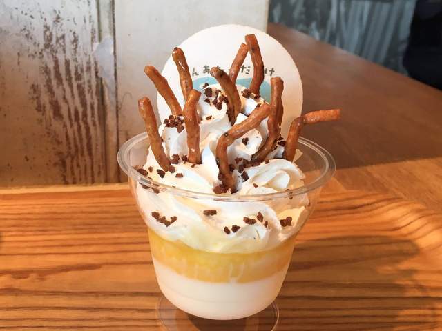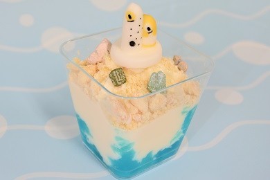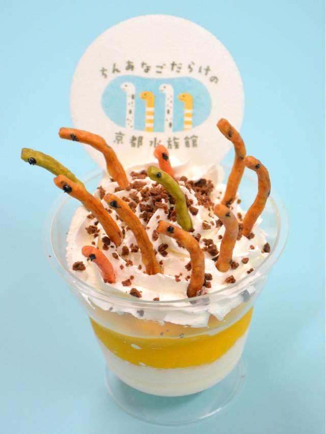 另外,京都水族館也推出以沙地中的花園鰻為構想的聖代,由海洋般的藍色果凍和香草慕斯組成,可以看到從沙子裡探出頭來的花園鰻棉花糖,可以說是好吃又好玩的一品。