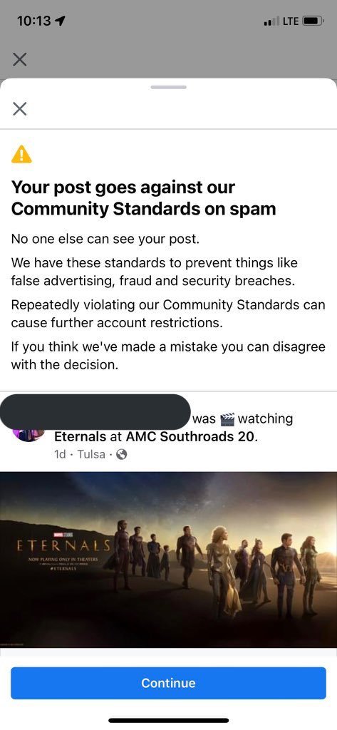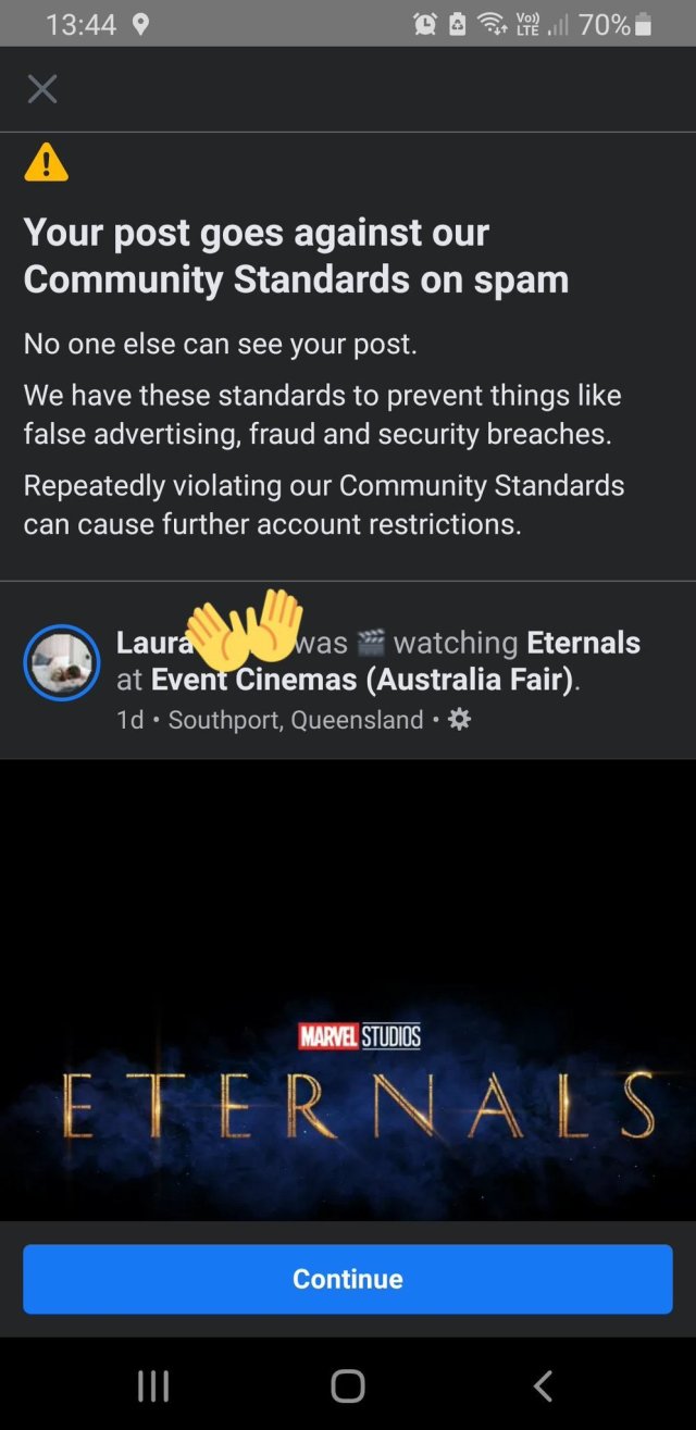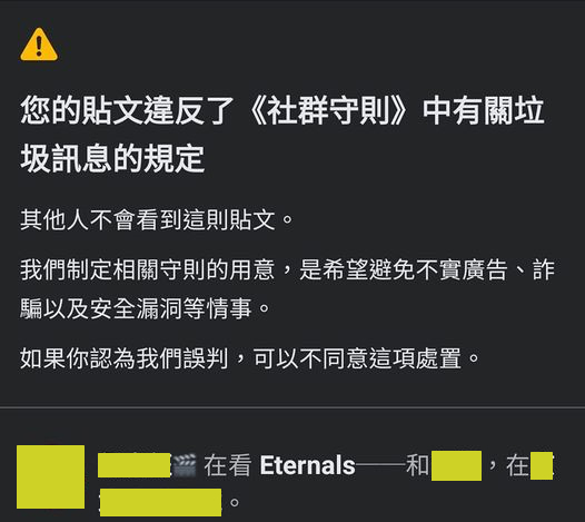 為什麼這麼說呢?事實上最近這幾天,有不少Facebook用戶在網路上抱怨著一種相當困擾的現象,只要在動態上發佈任何有關於《永恆族》電影的文章,並且打卡標記Eternals的話,你的文章就會馬上被臉書AI偵測而被光速秒刪,而且這樣的現象不僅是發生在歐美地區,在台灣同樣也有不少漫威影迷也因為打卡或是分享文章而被強制刪文。