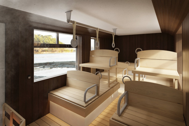 其中將會有種保留過往車廂的內裝模樣,包含座椅、扶手與吊環,透過改裝加入柴燒的木材火爐,組成復古巴士氛圍的三溫暖房。並可以使用下車按鈴後會將水降下至擺設的桑拿石,透過火爐加熱的桑拿石將水蒸發後形成水蒸氣,展現三溫暖的氛圍。