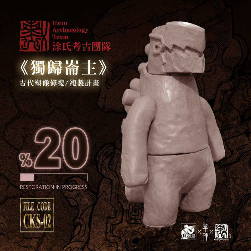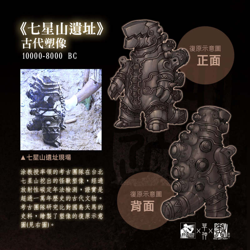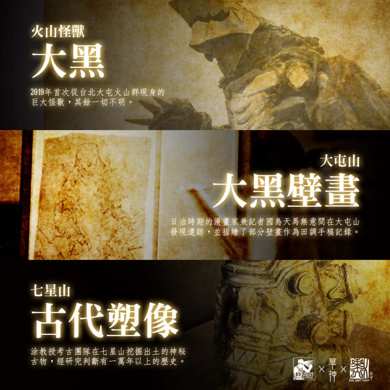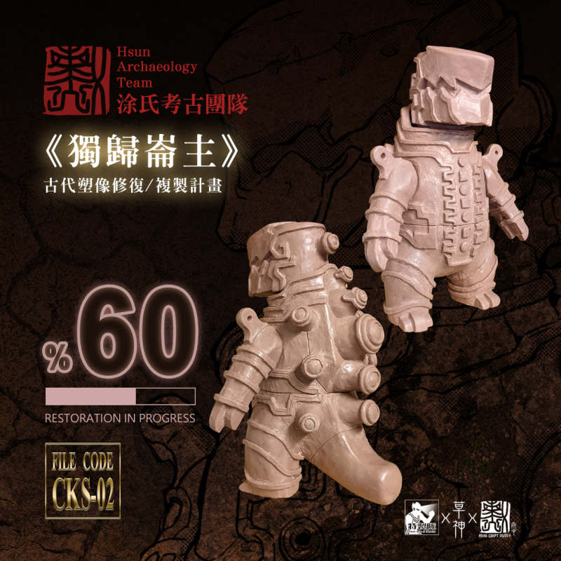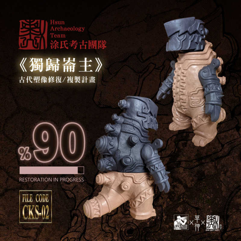 除了大屯山傳說的火山怪獸「大黑」之外,這次作品中的「古代塑像 獨歸崙命」也將立體化登場!於台北七星山遺跡挖掘出土的怪獸塑像,有著與大黑相似的頭部外型,身體卻是有如土偶、神像般的雕紋,散發原始信仰的神祕氛圍。