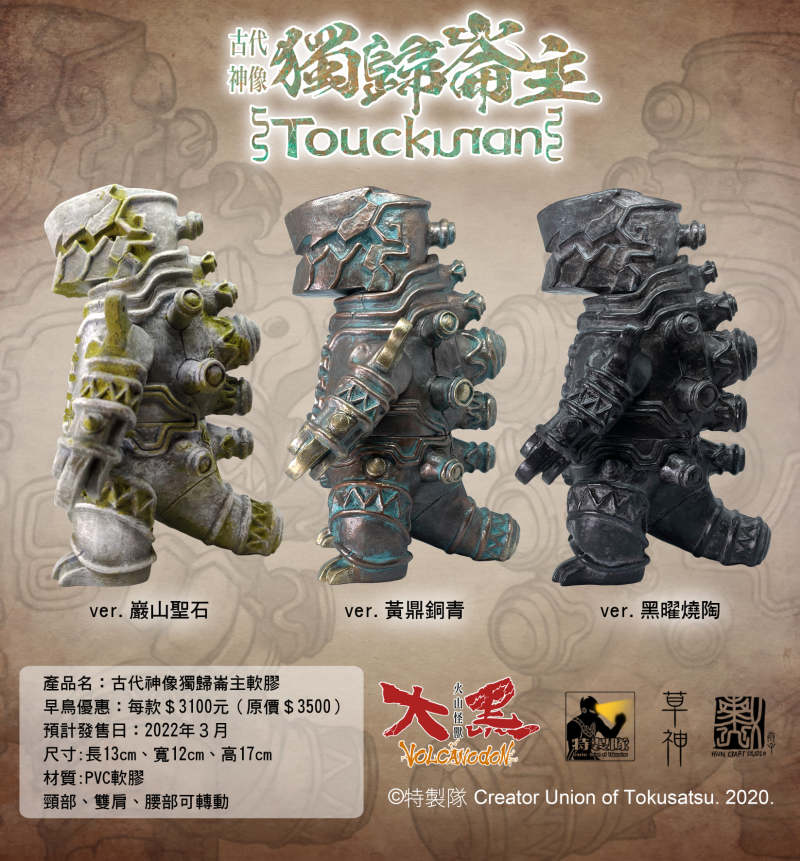 大黑襲來,有神快拜!由台灣特攝創作團體「特製隊Creator Union of Tokusatsu」所號召,集結台灣在地工作室協力,將怪獸作品《火山怪獸大黑》中的「古代神像 獨歸崙主」以軟膠玩具實體化推出啦!目前已開放預購,預計將於 2022 年 03 月正式發售。