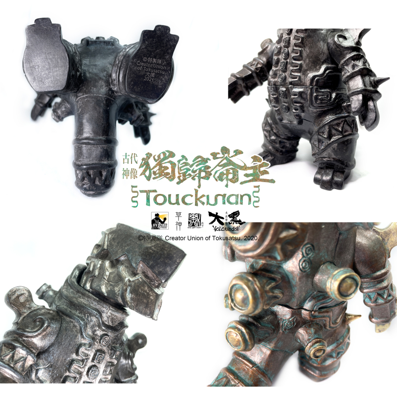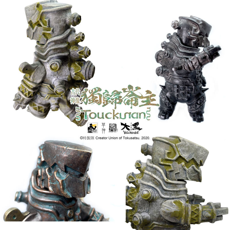 一共推出鑄銅般的黃鼎銅青、覆蓋著薄青苔的巖山聖石、新石器典型陶器黑曜燒陶三種款式,在頸部、雙肩、腰部設計有簡單的可動關節,精緻的仿舊塗裝,讓軟膠作品更具有份量與質感,也營造出經歷長久時間洗刷的年代感、古老的傳說與文明色彩,呈現出三種不同氛圍的大屯山之神,意圖使人選擇障礙爆發!!
