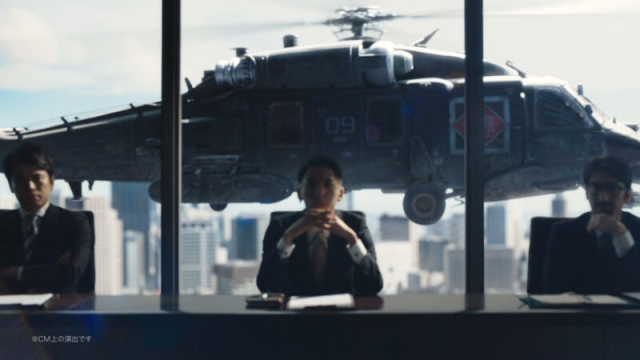 這次找來濱邊美波飾演神羅公司的候補士兵,在公司與面試官對談的過程中,為了表示希望公司的熱誠,窗外出現的直升機讓美波吃了一驚。轉過頭來已經即將登陸戰場的美波,穿上戰服登上戰場展現身手 !