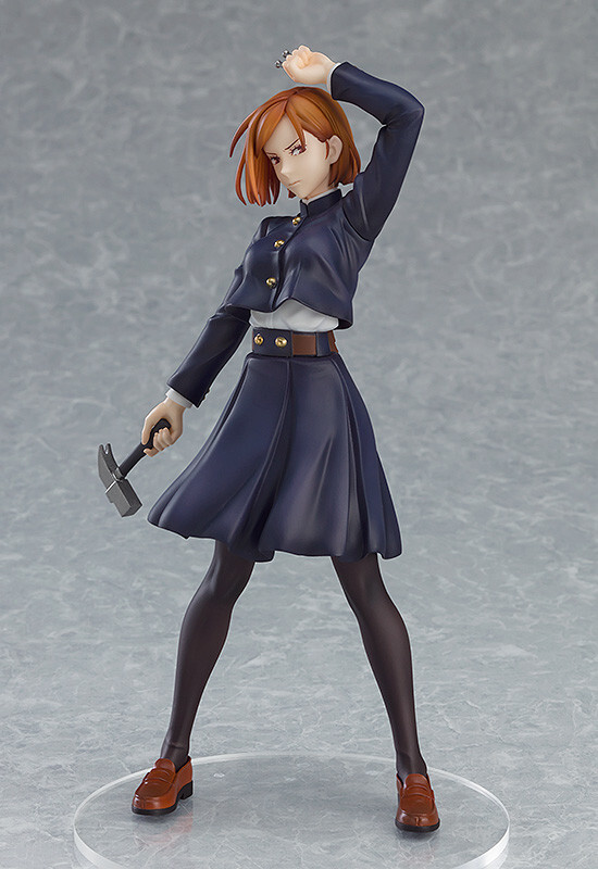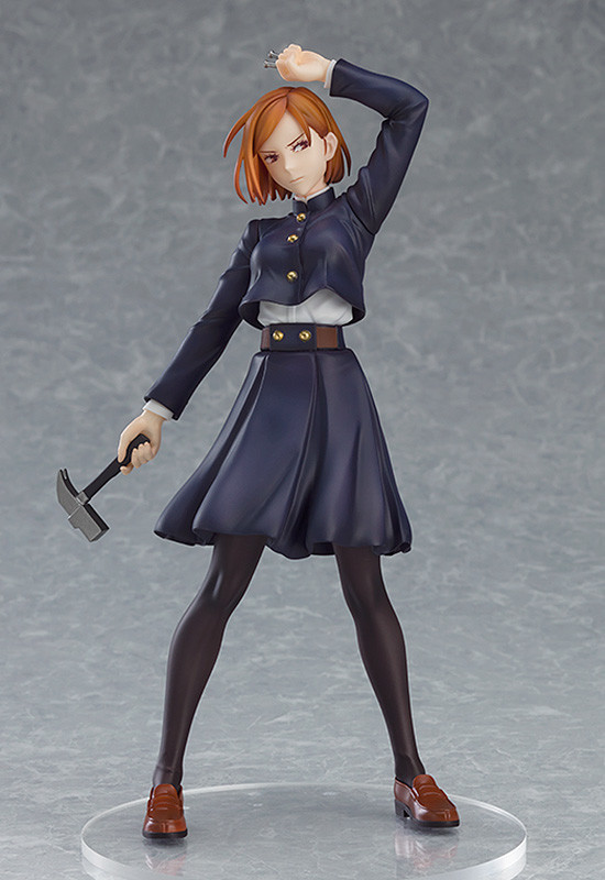 「POP UP PARADE 釘崎野薔薇」,尺寸全高約 170 mm,還原釘崎在動畫中的造型,包含茶色的短髮,以及咒術高專的黑色制服搭配黑絲襪的少女造型!一手拿著招牌鐵鎚、另一手則是指間夾著兩根五吋釘,臉上掛煞氣又充滿殺氣的表情,展現釘哥的大氣勢!