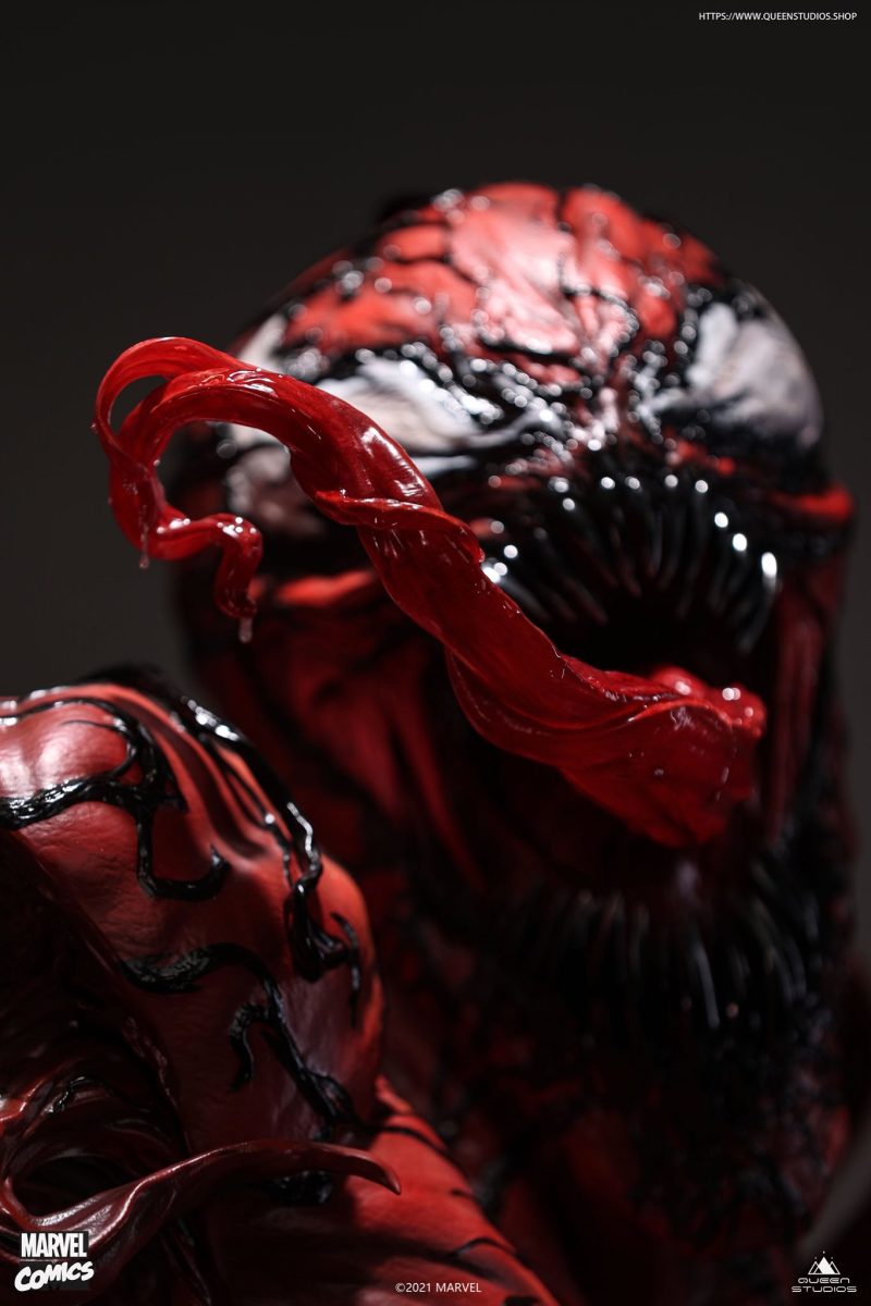 這次的「屠殺」胸像高度來到 74 公分,採用樹脂、Polystone 打造極具存在感的本體、舌頭,與彷彿下一秒就要低落、非常逼真的唾液,並同時展現出相當暴力的造型衝擊與精巧細膩的雕刻工藝,巨大、狂暴的雙眼散發強烈威懾感,而覆蓋在鮮紅軀體表面、奔騰攀附的黑色共生體也為本作堆砌出豐富的層次感,底座部分與先前的猛毒類似,是以共生體蔓延的造型與漫畫風格的「CARNAGE」字樣來設計,超兇!