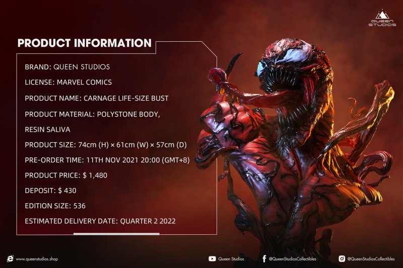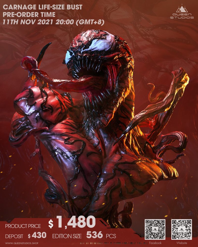 擅長以大比例雕像表現角色魅力、重現逼真細節的造型廠牌 Queen Studios 在推出「猛毒」之後,又於日前發表了出自 MARVEL 的 1/1 比例半身胸像新作,克萊圖斯·卡薩迪,也就是恐怖反派「屠殺」(Carnage)參戰!預計 2022 年第二季發貨。