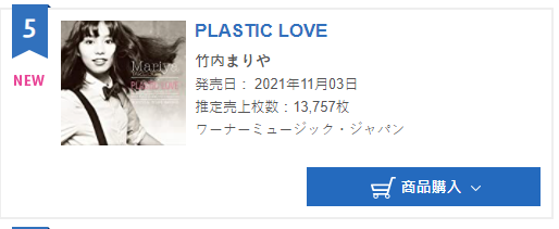 也因為這首〈Plastic Love〉的熱度,使得該張單曲黑膠唱片發行後不久,就在2021年11月15日的Oricon每週單曲公信榜排名中,列入了第五名的位置,這也是竹內瑪莉亞自1985年發行該張單曲以來,睽違36年再度進入了Oricon週榜前100名的位置。