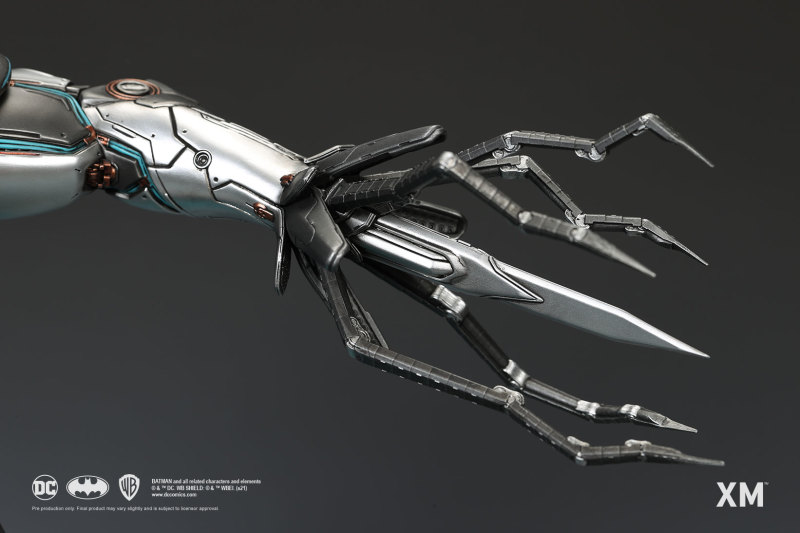 本作高約 55 公分,以 Polystone 為材質打造出在 Earth-44 中無人可擋、身體機械化的「蝙蝠俠-殺戮機器」,除了表現出銀色護甲厚重的金屬感之外,線條銳利的蝙蝠面罩、盔甲上頭的刻線、紅色蝙蝠標誌......等細節也充分還原,而遍佈全身的淡藍色線條、銅色零件也加深了整體的層次感,而且還附上兩種右臂替換件,在增加展示變化性的同時,也傳達出殺戮機器可變換身體構造的能力之一。