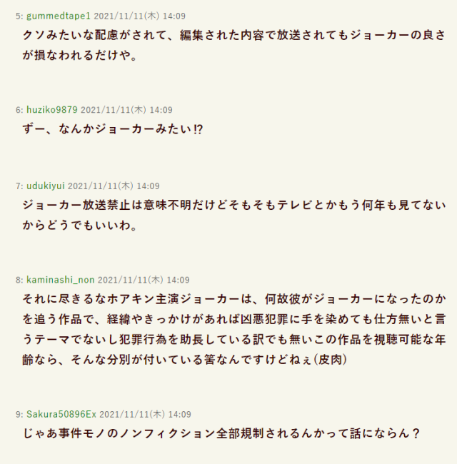 也因此,在該消息傳出後,不少電影迷也紛紛跳出來反對日本電視媒體這樣的決策,認為禁止播出電影《小丑》是沒有意義,且對於隨機傷人事件是沒有直接的幫助,更表示如果往後也有模仿別部作品的模仿犯,這樣那一部作品是不是也要受到無妄之災呢?