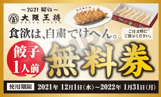 只要在活動期間不管是內用還是外帶點餐,都可獲得一張「餃子免費券」(餃子1人前無料券),此券是人頭的,若是一人點餐即一張,兩人即兩張,以此類推。該券能免費兌換一份招牌餃子套餐(水餃、炸餃子等套餐不算在內),兌換從12月1日開始,期限至2022年1月31日。