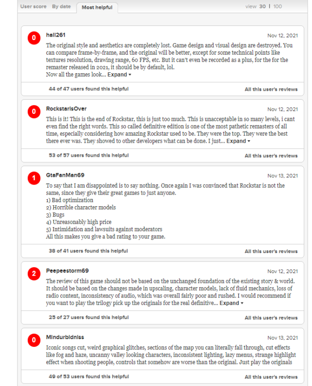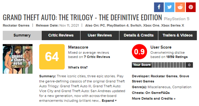 也因為如此,《俠盜獵車手:三部曲-最終版》的災情也反應在知名評分網站Metacritic上,可以看到整體評分不僅是以不到1分的成績創下最新低,除了對於以上大大小小的問題感到十分不悅外,更表示宛若半成品、過於粗糙的遊戲,是有失R星過往水準的失誤,令人相當失望。