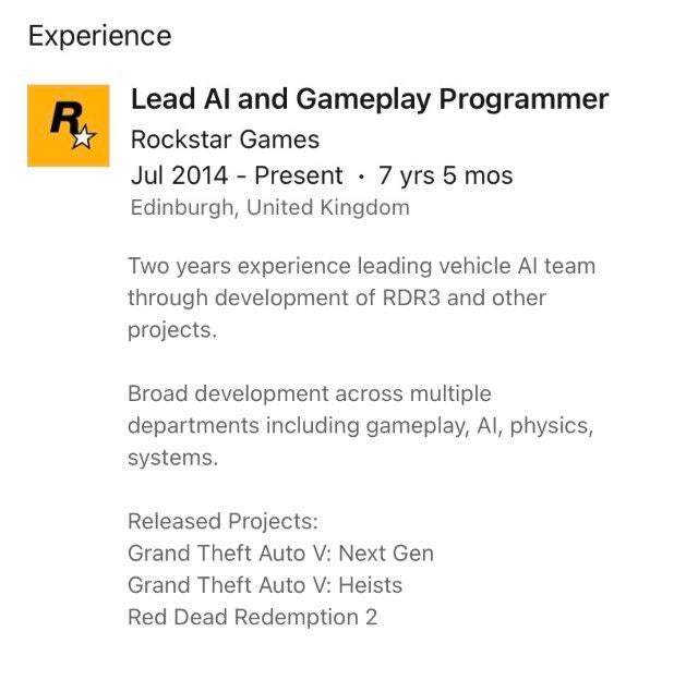 據報導,在LinkedIn上的這名R星員工,是曾負責過《碧血狂殺2》(Red Dead Redemption 2)、《俠盜獵車手V》(Grand Theft Auto V)線上模式「Next Gen」與「Heists」,並且似乎目前正在著手進行《碧血狂殺3》與其他項目的製作。