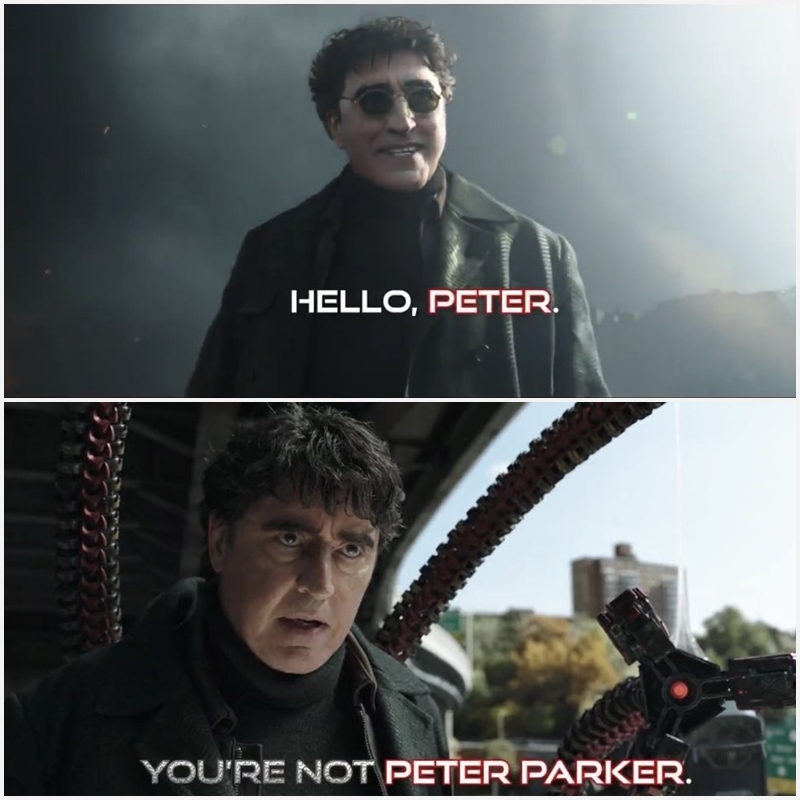 當彼得解除鋼鐵蜘蛛裝的面罩時,八爪博士說『你不是彼得帕克』。 因為在八爪博士原本的宇宙裡,彼得帕克是陶比麥奎爾飾演的。 這句話也間接證實了陶比麥奎爾版本的蜘蛛人是存在的。