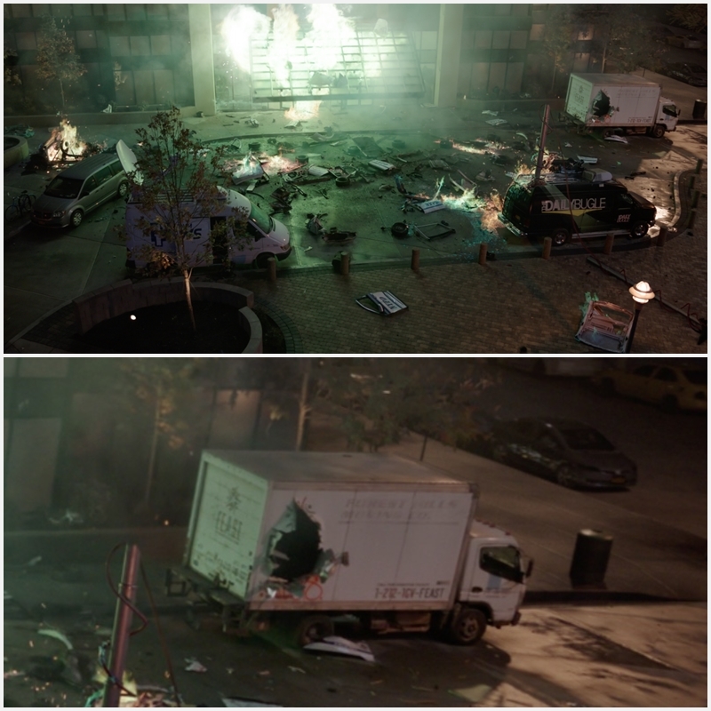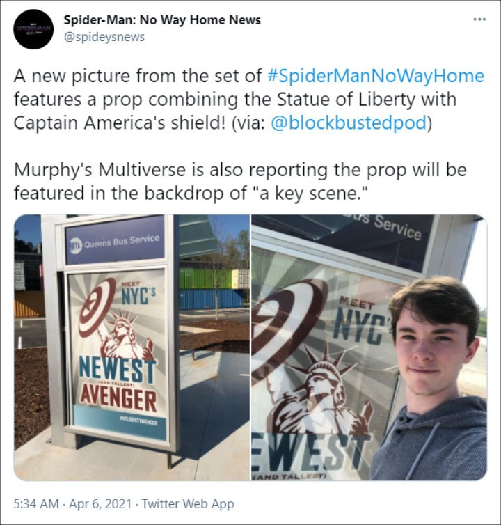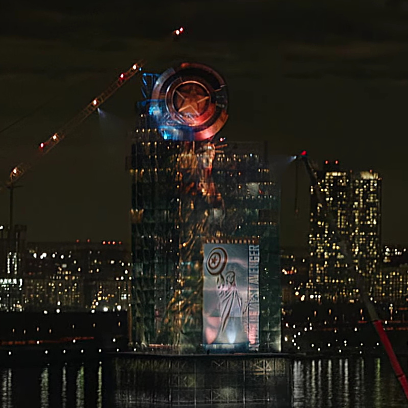 遠處可以看到拿著美國隊長盾牌的自由女神,在本集電影中,紐約市正在改造自由女神像讓她拿著盾牌。先前在拍攝時,也被路人拍下了路邊的道具海報。
