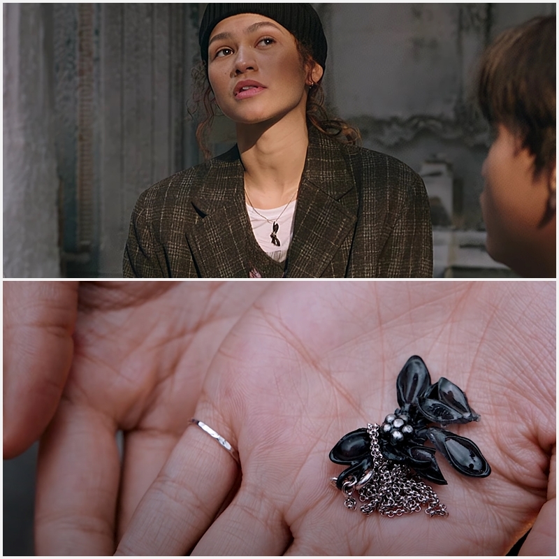 在這一幕,我們可以看到MJ還戴著彼得在《蜘蛛人:離家日》時送給她、後來碎掉的黑色大里花項鍊。