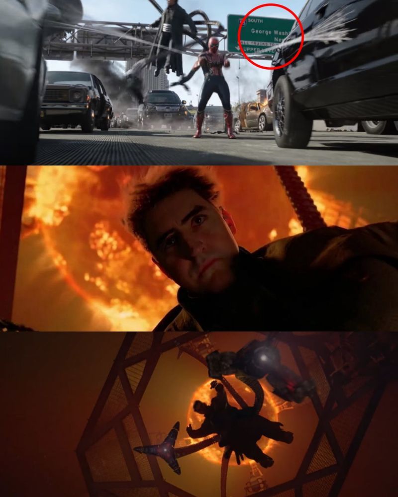 八爪博士與綠惡魔攻擊的地點是喬治華盛頓大橋,值得注意的是,喬治華盛頓大橋橫跨哈德遜河,而八爪博士在《蜘蛛人2》結尾就是墜入哈德遜河。透過演員艾佛列蒙利納稱,八爪博士的故事會從這裡直接延續。