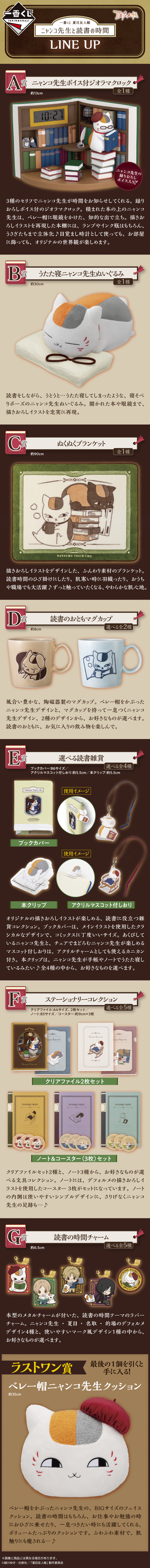 一番賞 夏目友人帳 貓咪老師的讀書時間」,一共推出全 7 等級+最後賞的獎品,以慵懶可愛的超萌貓咪老師為主角,讓貓咪老師陪你一起度過讀書時光~獎項分別為 A賞 貓咪老師雕像時鐘、B賞 貓咪老師睡覺布偶、C賞 貓咪老師絨毛毯、D賞 馬克杯、E賞貓咪老師閱讀用雜貨(書套/書籤)、F賞貓咪老師文具收藏(文件夾/杯墊/筆記本)、G賞貓咪老師閱讀時間吊飾等豐富的獎品,最後賞更是超療癒的貓咪老師室內拖鞋~