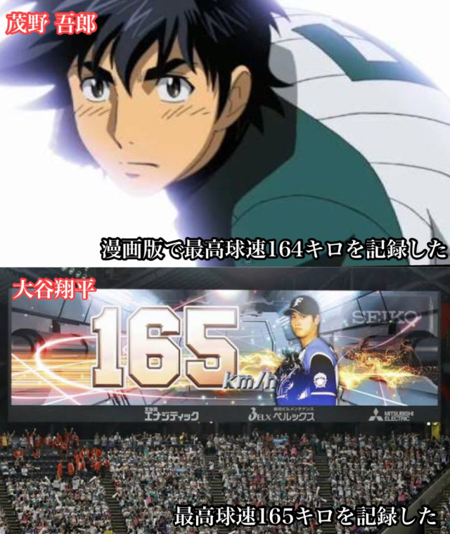 首先提到的就是運動相關的啦 ! 想必不少人都看過經典的棒球漫畫《棒球大聯盟》,劇中主角茂野吾郎曾投出 164 km 的速球紀錄,在當時日本棒球界可說是遙不可及的駭人數字。沒想到後來出現了「投打二刀流」的大谷翔平,不但打擊優異外,在日本職棒時期更投出了 165 km 的日職紀錄,超越了漫畫中茂野吾郎的紀錄,大谷翔平不愧是有如玩電動才能培育出的開外掛選手阿 XD。