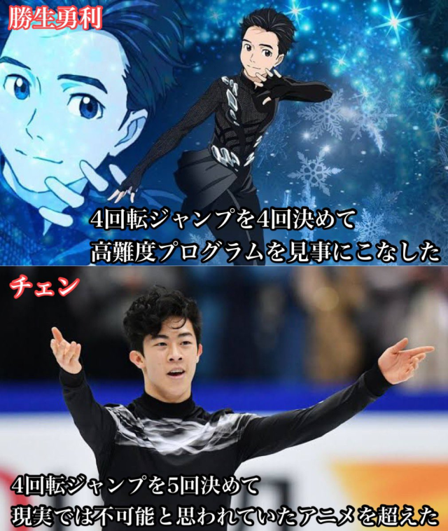 接著是花式滑冰,於 2016 年播出的動畫《YURI!!! on ICE》 中的主角-勝生勇利,劇中曾表現出在賽事中完成四種四周跳,也是當時非常具有難度的紀錄之一。而近年在花式溜冰賽事中,完成世錦賽3連霸&美國花式滑冰錦標賽男子組5連霸的美國華裔選手-陳巍(Nathan Chen),更是在真實賽事中目前唯一成功完成五種四周跳的選手,可說是超越了動漫作品。