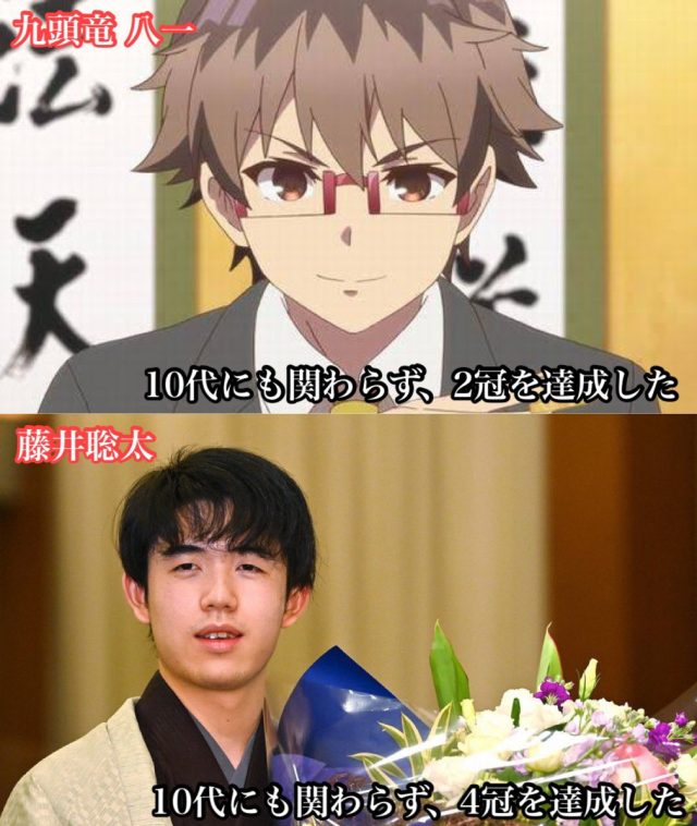 接著是最近成為史上最年少將棋四冠王的藤井聰太了,他與輕小說作品《龍王的工作》中主角-九頭龍 八一有著類似的經歷。但目前藤井以奪冠數就已經超越了八一在作品的紀錄,也讓不少人驚訝這位如此年輕的選手居然可以在 19 歲就在將棋這個競技擊倒各路好手,已有王位、叡王與棋聖三個頭銜 。連《龍王的工作》作者白鳥士郎都驚嘆 : 「現實比虛構還離奇...」