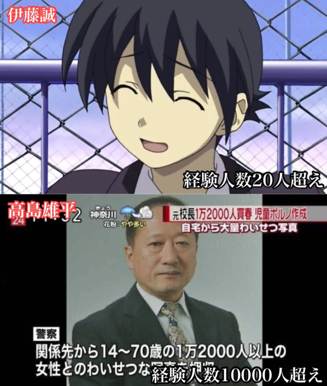 最後就是...推主自己的私心吧 XD,他以《School Days》系列作中的被稱作「動漫第一渣男」的伊藤誠為例,伊藤誠在劇中與各系列遊戲中攻略了超過 20 蔚女性角色。不過現實中,在 2015 年日本發生的重大新聞,被爆出日本「色慾校長」高島雄平 25 年來嫖娼一萬多女性,更包含 1000 多名未成年少女,更拍攝多數猥褻照片,造成當時社會上很大的震撼。不過...誠哥可沒有嫖妓阿 XD,人家可沒有靠金錢來買春耶www,這個比較小編給不及格 !!