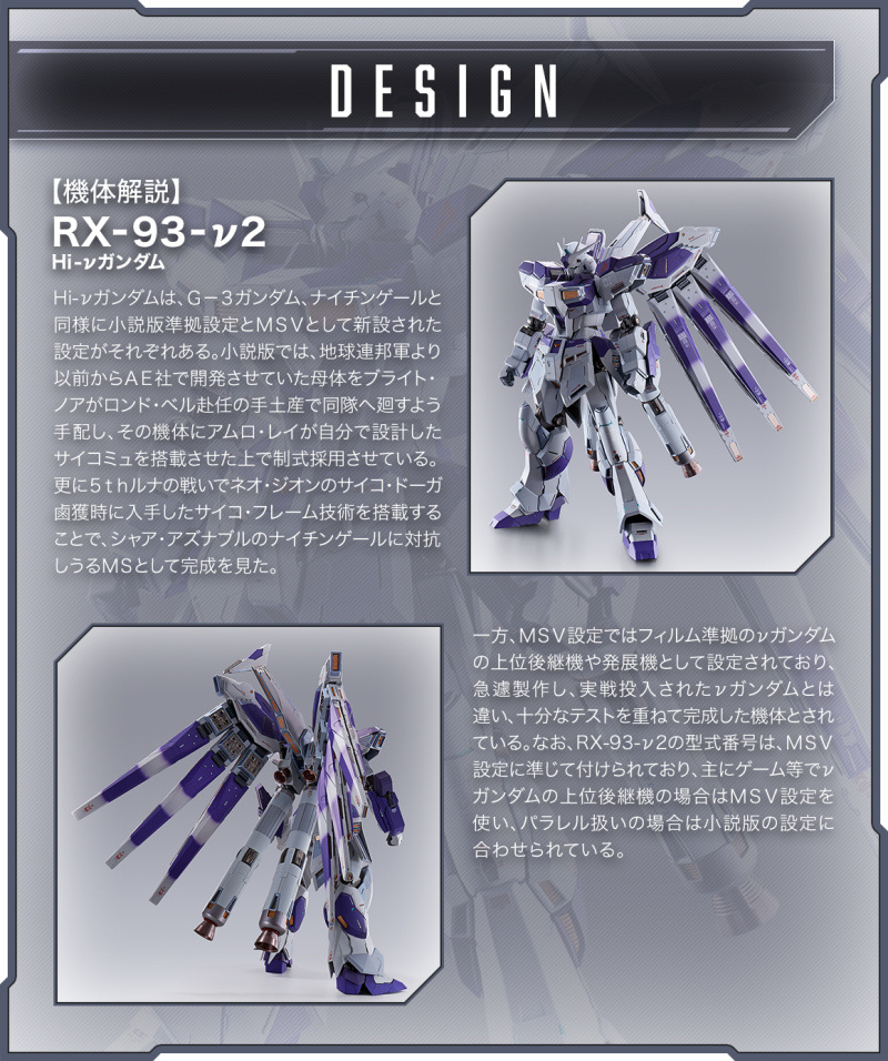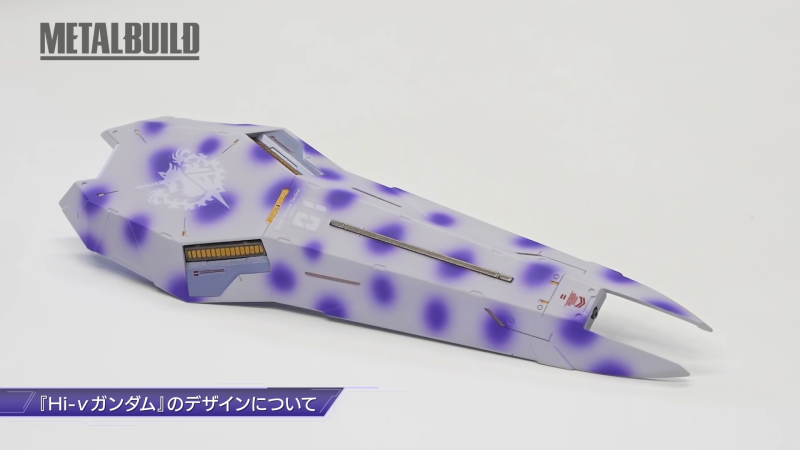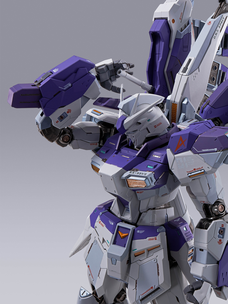 「METAL BUILD Hi-ν鋼彈」基於機械設計師出淵裕所設計的版本製作,造型確實融入 METAL BUILD 風格進行詮釋,再現較為寬大的身軀與迷人的紫白配色,在翼裝感應砲、盾牌上也施以出渕裕版特徵的紫色漸層、圓點塗裝。採用多數合金零件製作,並使用電鍍加工等技法賦予更高密度的細節表現。