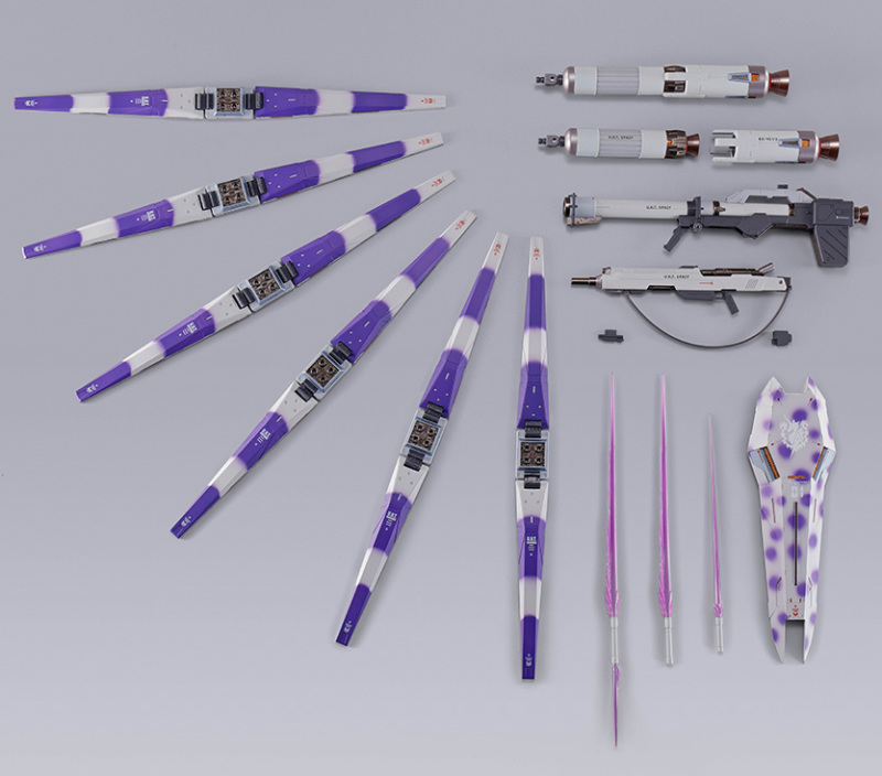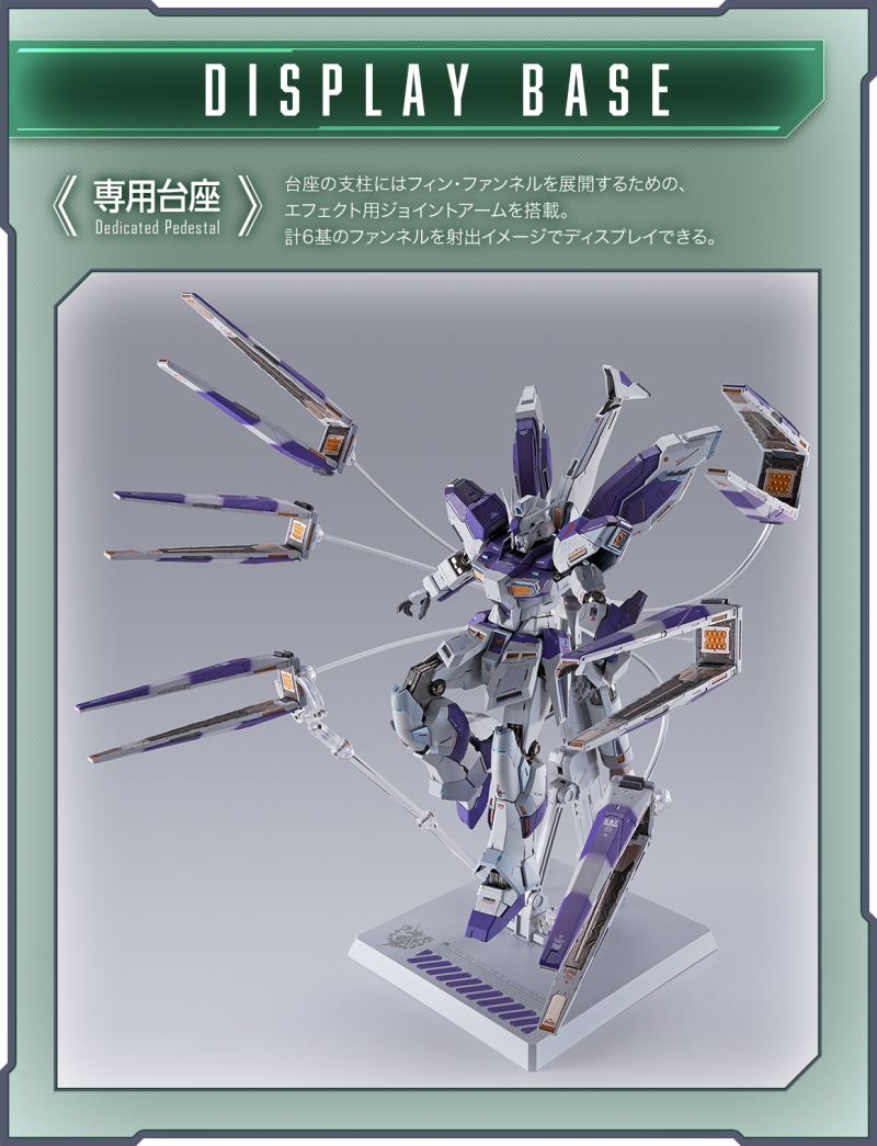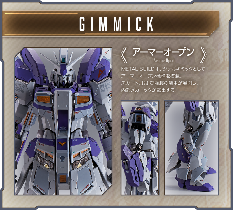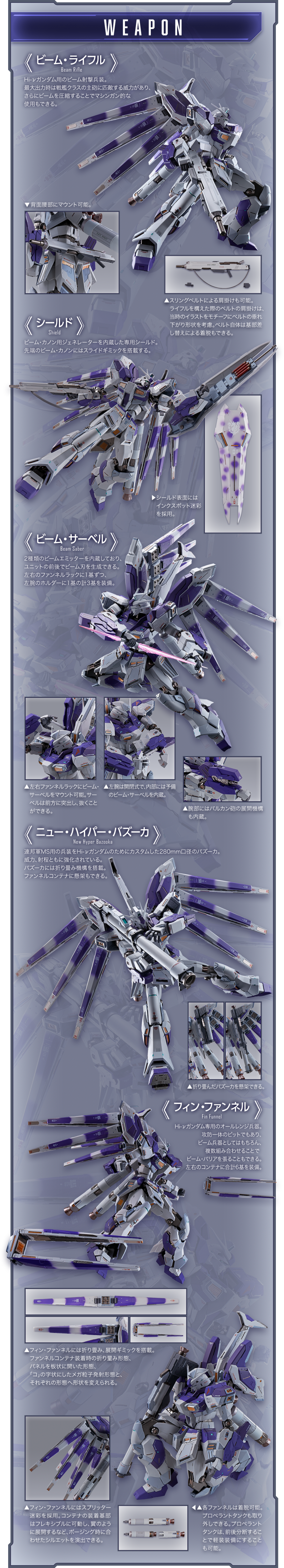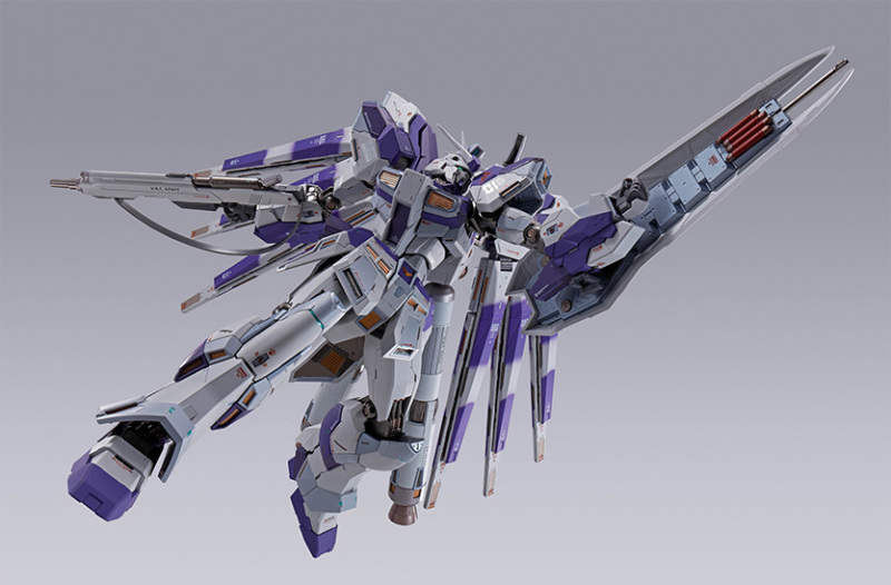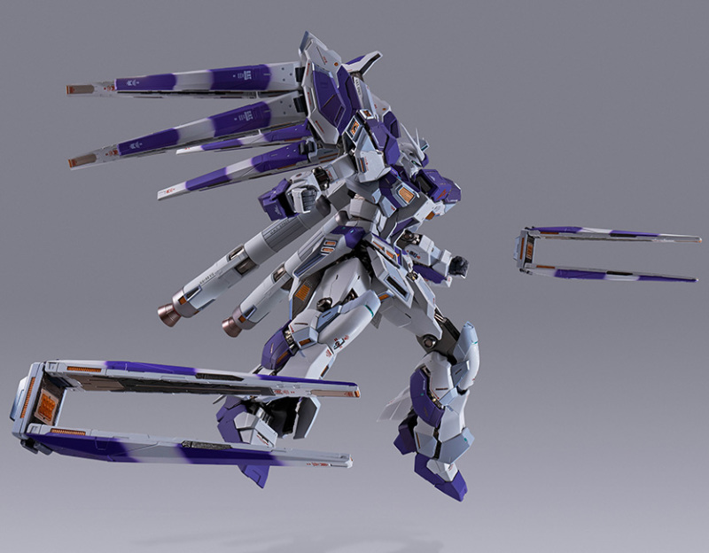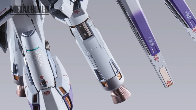 此外 METAL BUILD Hi-ν鋼彈還內藏裝甲展開機構,包含小腿後側裝甲、手臂裝甲、前裙甲、胸部裝甲、肩甲等多處皆能滑動展開露出內構。武裝則有裝設軟材質背帶的光束步槍、收納於左腕與背包的光束軍刀、前端可伸出槍口的盾牌、新型超絕火箭炮,背部的六枚翼裝感應砲如同原作設定能夠拆卸、變形,搭配專用透明支架再現發射狀態。
