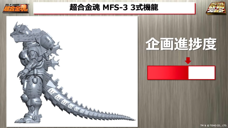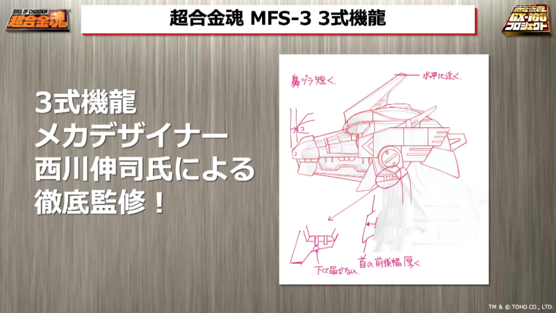 「超合金魂 MFS-3 3式機龍」將由設計師西川伸司全面監修,和數年前的超合金版(GD45)相比,採用最新技術製作的 3 式機龍具備更為精密的細節造型,表現金屬的硬質與銳利感,具備大尺寸與眼部發光機構,同時也會附上「背包組件」、「腕部磁軌砲」...等多種武裝,再現劇中魄力的戰鬥姿態。目前開發進度約為 6 成,未來預計陸續公佈更多情報。