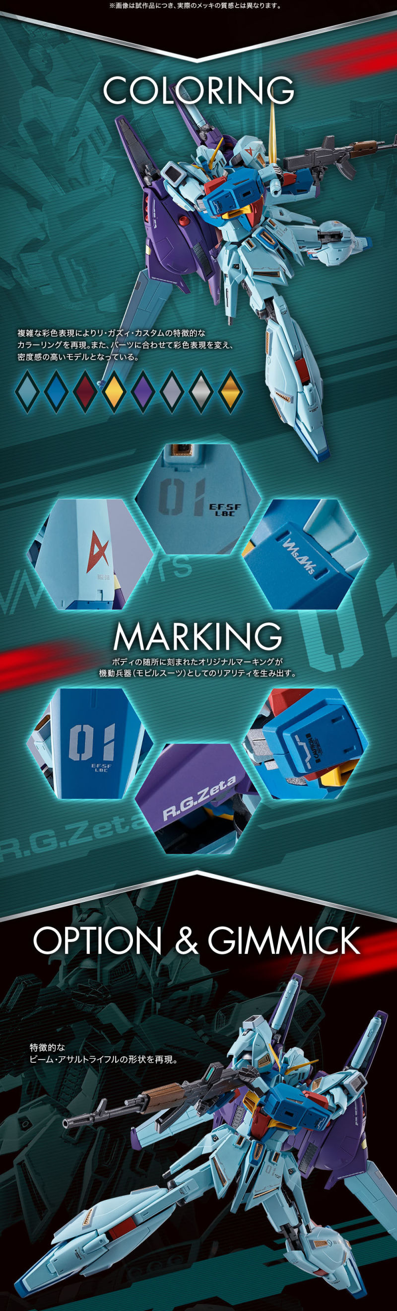 「METAL ROBOT魂 Re-GZ 特裝型」由擔任機械設計的明貴美加親自監修,同時具備洗練、精悍的造型與從 MS 形態變為 WR 形態的變形機構,多數關節採用合金零件製作並經過電鍍加工呈現高級感,全機外裝也施以 8 種消光色、金屬色塗裝,印刷出豐富的機身標誌,讓機體更加寫實、具備厚重感。
