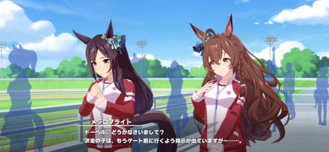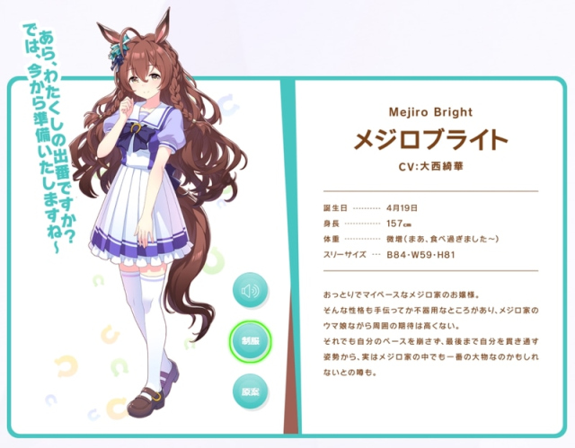 11月18日在官網上公開的新角色剪影讓許多玩家議論紛紛,其中有很多明顯的關鍵字,如「メジロ家」、「生日4月19日」,而剪影也有露出一點應該是栗毛馬(棕毛馬),在這些線索中大家猜測的答案只有一個,而19日,也就是今天,官方公開了新角色的真面目,那就是目白家的新成員—目白光明(メジロブライト)。