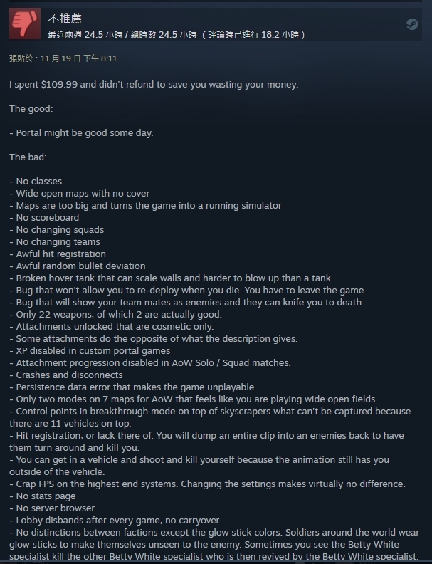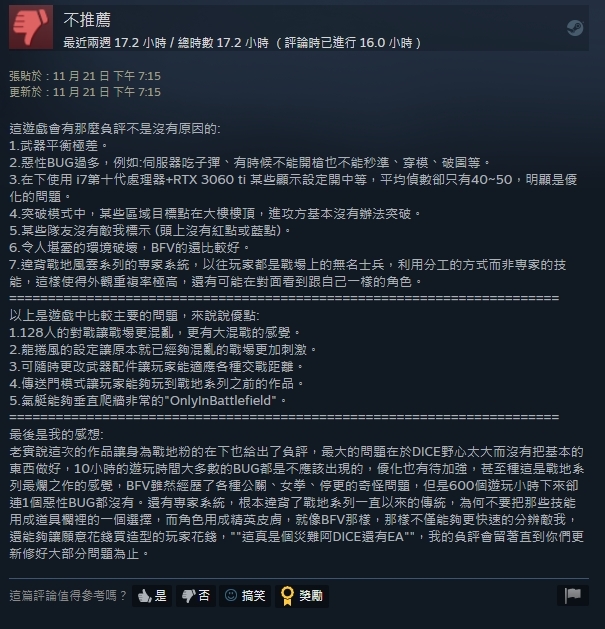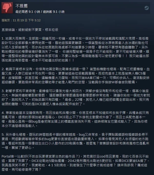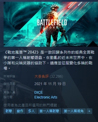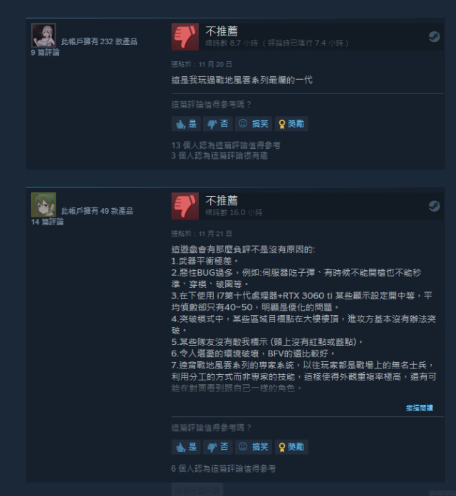 而這殘破不堪的半成品電玩,在《戰地風雲 2042》發售不久就立即掀起一波炎上,多數玩家不僅是在Steam上狂刷一票負評,商店頁面的評分顯現「大多負評」的評價外,留言的部分也能見到網友們呼籲尚未購買但有意考慮的其他玩家千萬不要買,甚至在各大社群網路上更出現了諷刺該款電玩的迷因梗圖。