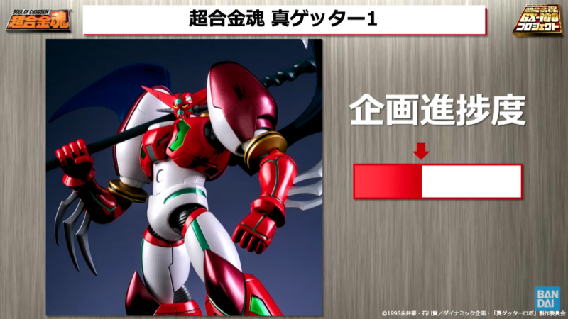 「超合金魂 真蓋特1」運用精密造型、合金零件再現誇張的頭身比例、誇張粗壯的軀幹與四肢,並附有巨大的飛翼與斬鐮,透過多種可動機構能再現極具氣勢的動作,腹部更有特殊機構能夠重現發射必殺技「蓋特光束」的姿態。不過目前開發進度約莫四成而已,距離正式發表還要再等等。